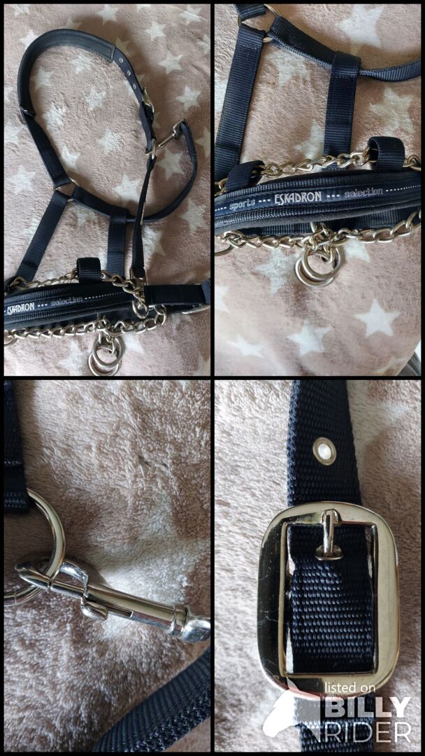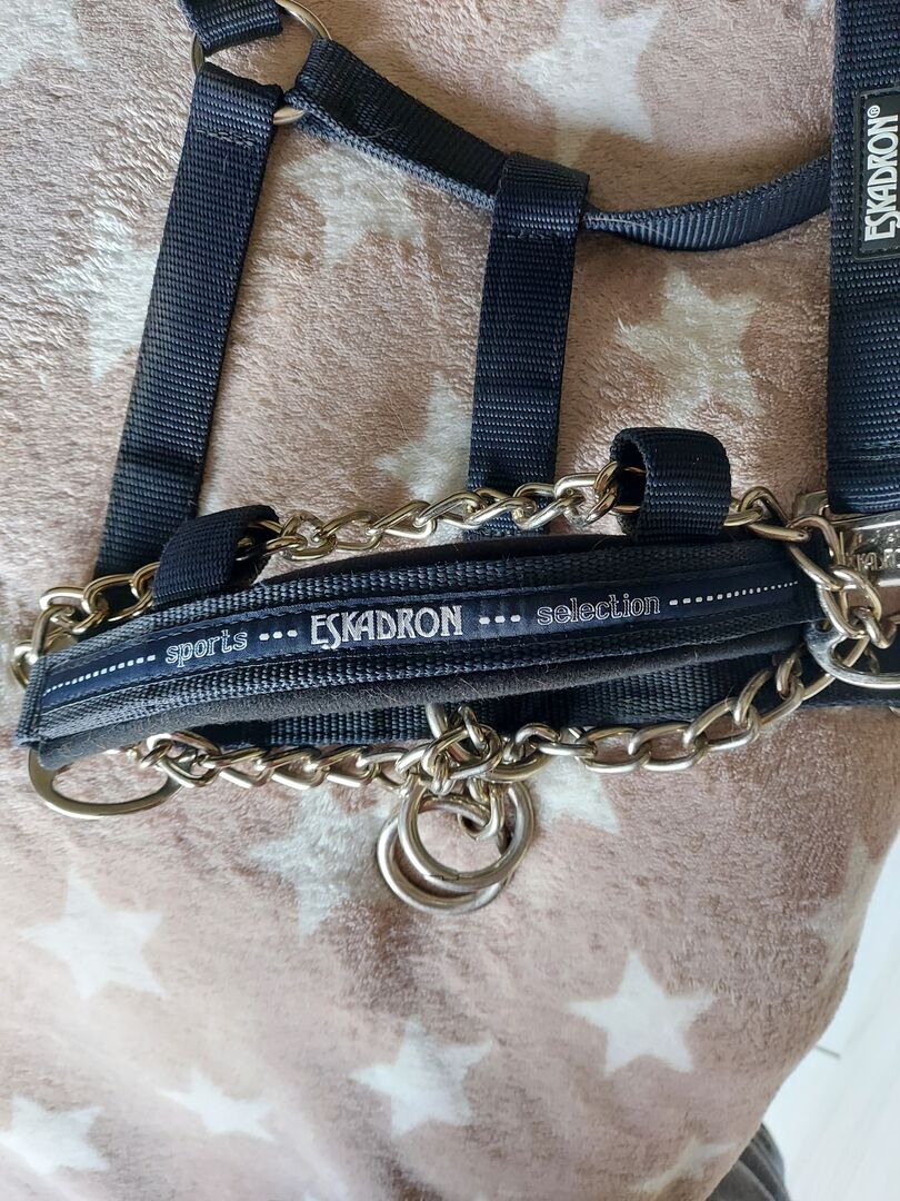 Halter kontrolny - Sprzedam halter kontrolny Eskatron w kolorze ciemnoniebieskim. rozmiar WB Używany 3 razy, teraz jest za mały. Kantar, części metalowe i łańcuch są czyste i nie zardzewiałe.