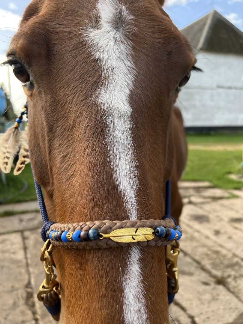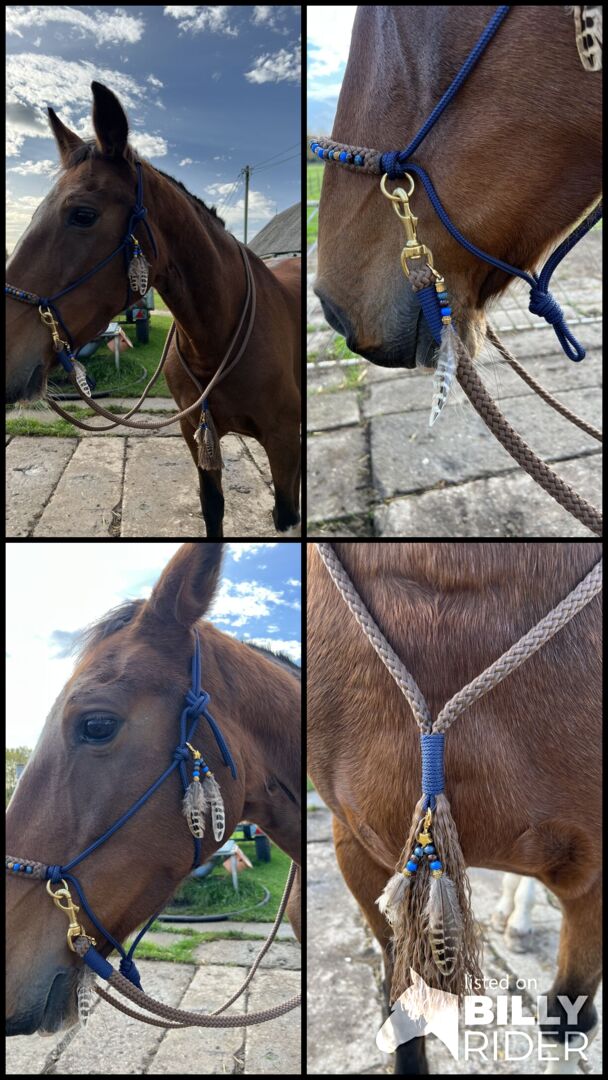 Halter Set z węzłami - Zestaw został użyty raz do zdjęć. Nie posiada żadnych śladów użytkowania. W rozmiarze WB. W zestawie znajdują się również dwa klipsy do grzywy, które pasują do zestawu.