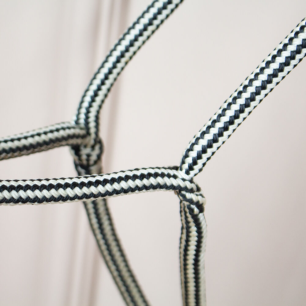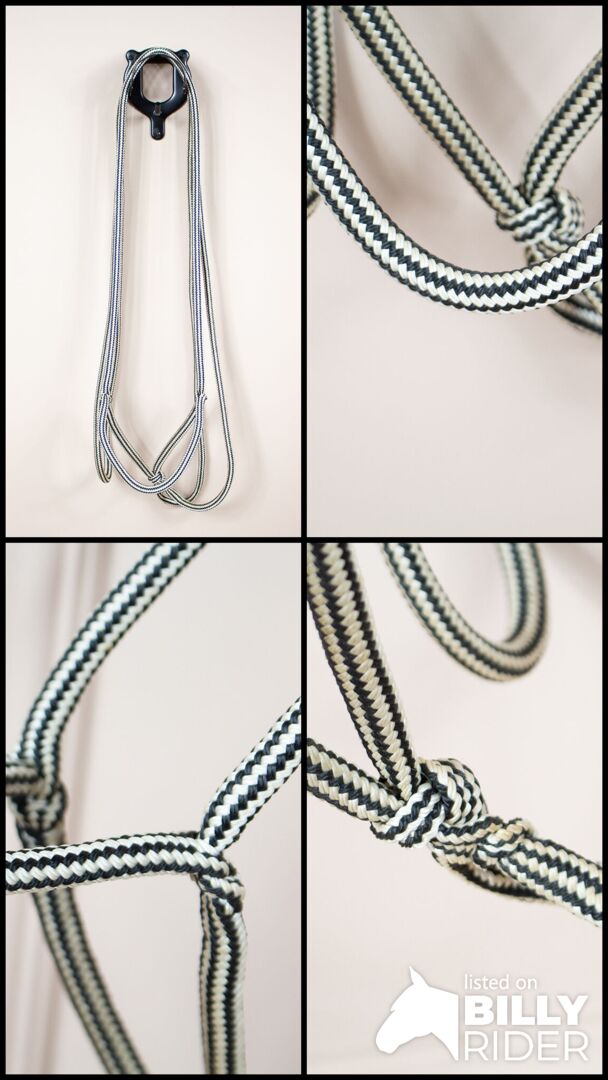 Halter turystyczny z resztą czarny/biały VB - Czarno-biała halter spacerowy ze szpicrutami jest w rozmiarze rasowym. Posiada zintegrowane i zamknięte reiny. Halter ma średnicę około 1,4 cm. Jest w dobrym stanie i posiada jedynie niewielkie odbarwienia. To the seller's offerlaunch