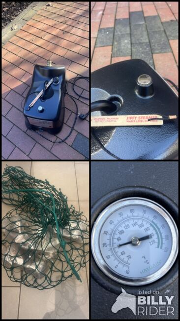Sprzedam mało używany HG One (generator pary i pojemnik) wraz z akcesoriami: duży worek na siano (nieużywany), żaroodporna siatka na siano, odkamieniacz do generatora pary, przecinak do bel siana. Pojemnik może pomieścić 5-7 kg siana.