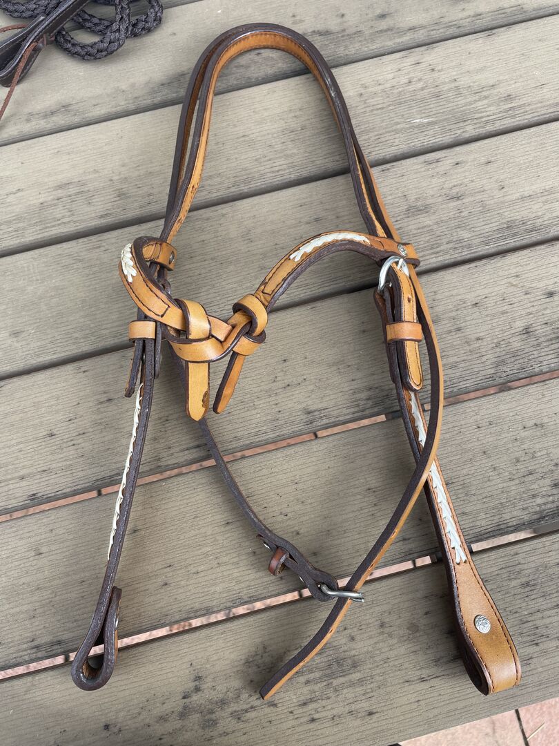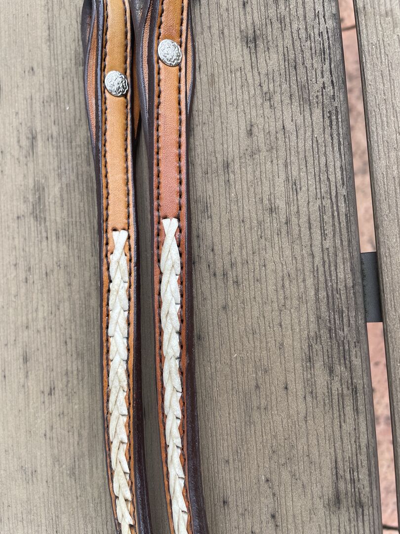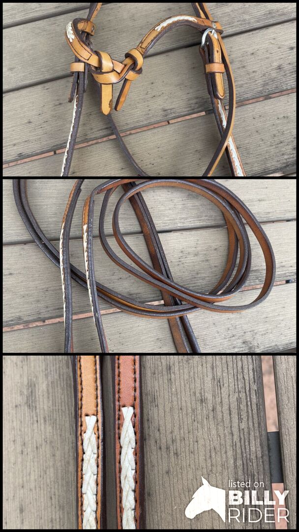 Headstall z surową skórą VB z lejcami - Nieużywany naczółek wykonany z jasnej skóry z oplotem z surowej skóry. W komplecie lejce, również z surowej skóry. Odbiór lub wysyłka plus koszty