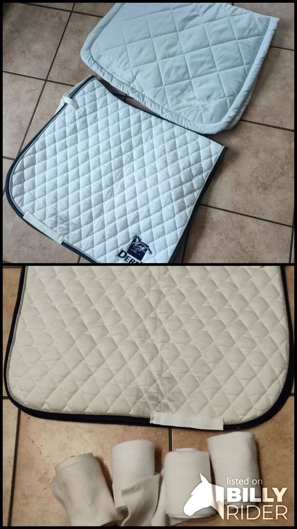 Hennig Saddle Pad White, Derby Saddle Pad, Set of 4 Bandages od 3 - Podkładka pod siodło Hennig biała bardzo dobry stan NP 65€ teraz tylko 19€ Podkładka pod siodło Derby biała 6€ Bandaże zestaw 4 białe 3€ Sprzedaż prywatna Wykluczam wszelką odpowiedzialność za wady materiałowe brak wymiany lub wymiany