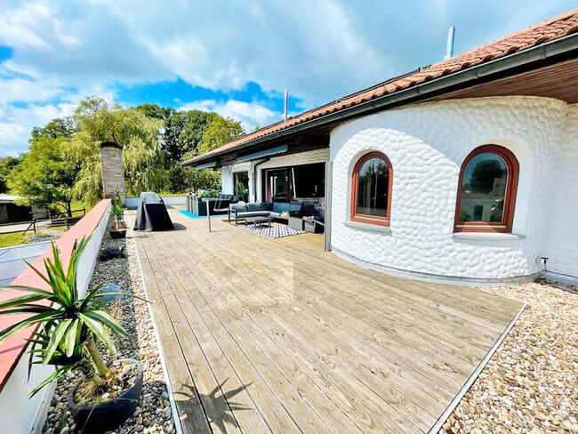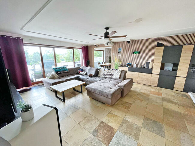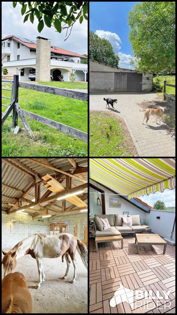 Hesja, powiat Fulda - duży dom mieszkalny na sprzedaż z mieszkaniem i stajniami - Wschodnia Hesja, powiat Fulda, 36154 Hosenfeld/Jossa Prywatna nieruchomość w spokojnej okolicy na obrzeżach wsi ze stajniami i piękną łąką dla koni Działka o powierzchni 28 109 m2 🔸~ 330 m2 powierzchni mieszkalnej + 240 m2 powierzchni użytkowej, zbudowany w 1978 roku, mieszkanie babci z tarasem na dachu na najwyższym piętrze, dom jest supernowocześnie wyposażony, najlepsza technologia, z wieloma "dzwonkami i gwizdkami" 🔸UG = 3 pokoje, 2 pokoje wielofunkcyjne, 2 łazienki, 1 WC Parter = 2 pokoje, salon, jadalnia, kuchnia, pomieszczenie gospodarcze, 1 łazienka, 1 WC DG = 2 pokoje, salon/jadalnia, kuchnia, pomieszczenie gospodarcze, łazienka Otwarta stajnia ok. 180 m2 dla ok. 5 koni, magazyn siana, miejsce na obornik, ujeżdżalnia obecnie używana jako boisko do piłki nożnej, 18 m okrągły kojec Podwójny garaż, 4 miejsca parkingowe, garaż na motocykl, piwnica na rowery Odkryty basen, sauna + sala fitness (kryty basen można łatwo przywrócić), buda dla psów lub kurnik, warsztat, nadzór wideo