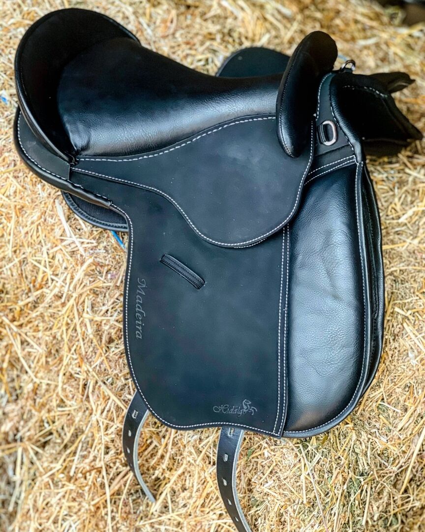 Madeira ma bardzo miękkie siedzisko, otwarte zawieszenie strzemion, skórzane drzewo Hidalgo i panele siodła na rzepy.