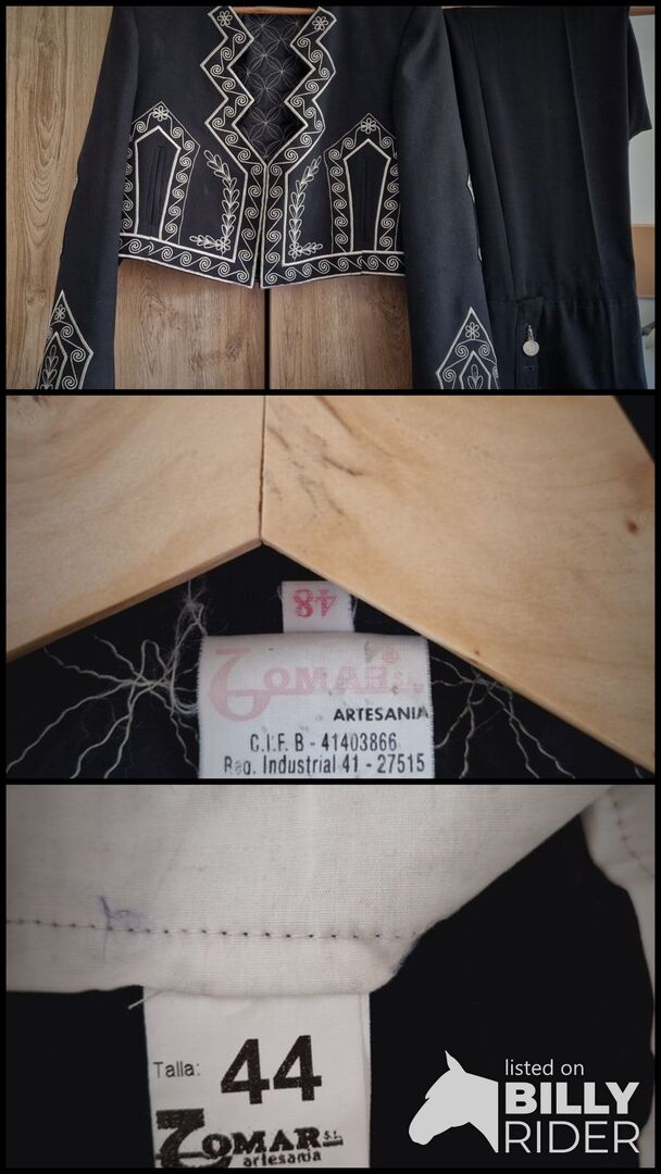 Hiszpański strój jeździecki - Sprzedam moje hiszpańskie bolerko jeździeckie, bolerko jest w najlepszym stanie! Było noszone 1x na pokazie i 1x na strzelaniu.BOLERO w kolorze czarnym ze srebrnym. Na zdjęciach są hiszpańskie rozmiary Bolerko powinno mieć 38/40, dokładnie na mnie pasuje. Jeśli jesteś zainteresowany po prostu skontaktuj się ze mną. Hiszpańskie spodnie są już sprzedane.