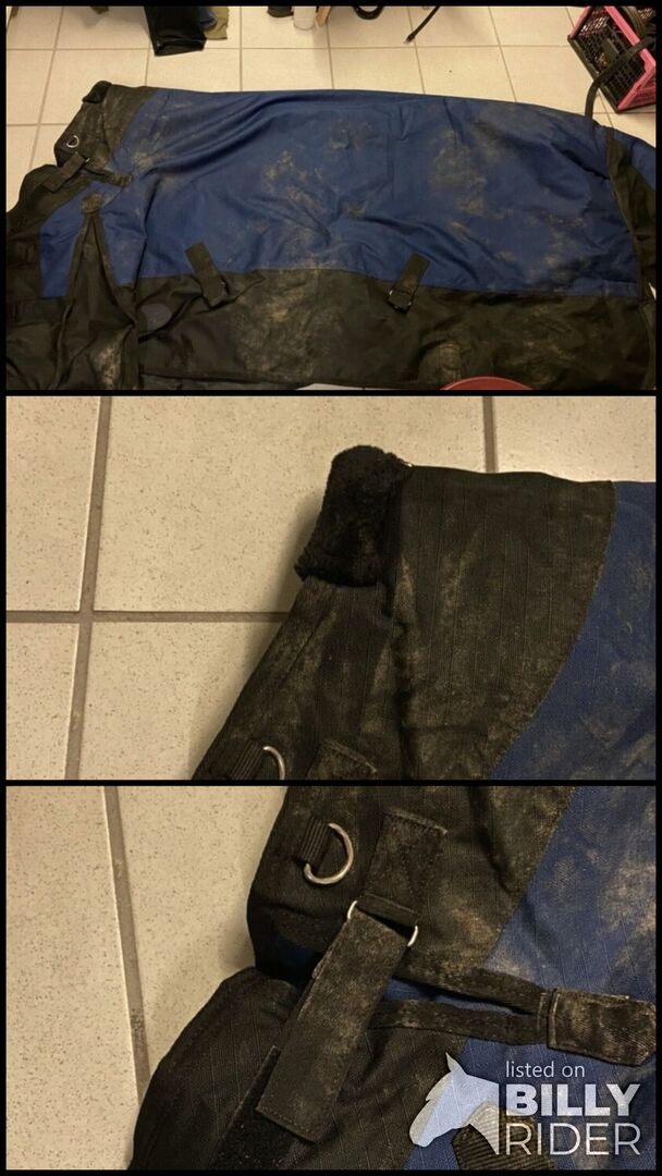 Hkm 200g Highneck Outdoor Blanket 145 - Oferuję koc zimowy 200g Highneck firmy Hkm w rozmiarze 145cm. Koc ma możliwość regulacji rozmiaru szyi. Koc jest świeżo wyprany, niestety plamy nie wychodzą, ponieważ nasza pralka jest za mała. Wystarczy wyprać ją raz w dużej pralce i będzie jak nowa :) Brak wad