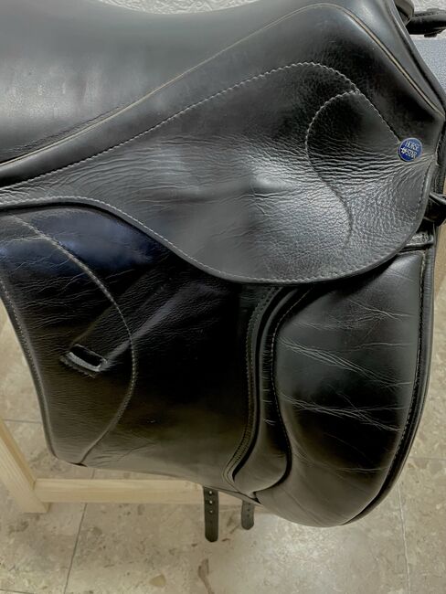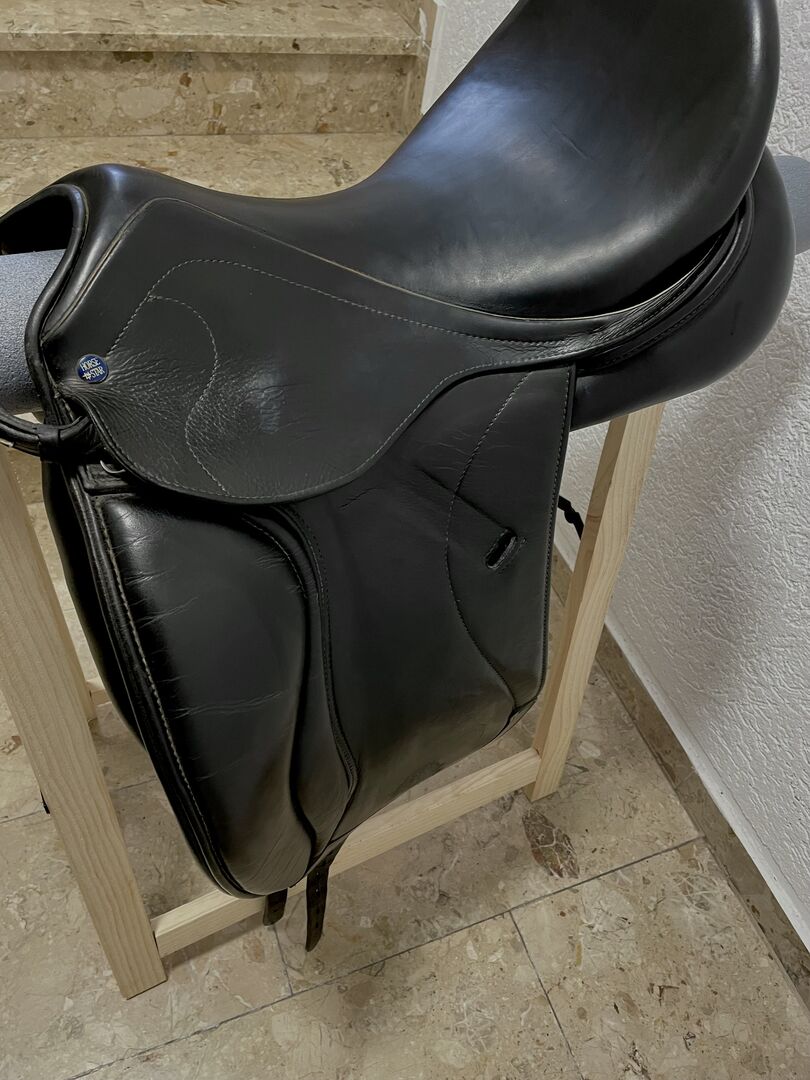 Siodło jest wykonane z wysokiej jakości czarnej skóry i nadal jest w dobrym stanie: - Specjalny system wpustu FSHL dla optymalnej swobody ramion . Może być wielokrotnie zmieniane - V-girthing z paskami do popręgu - Dostępne paski na rzepy - Wcześniej zamontowany na dużym koniu z wysokim kłębie