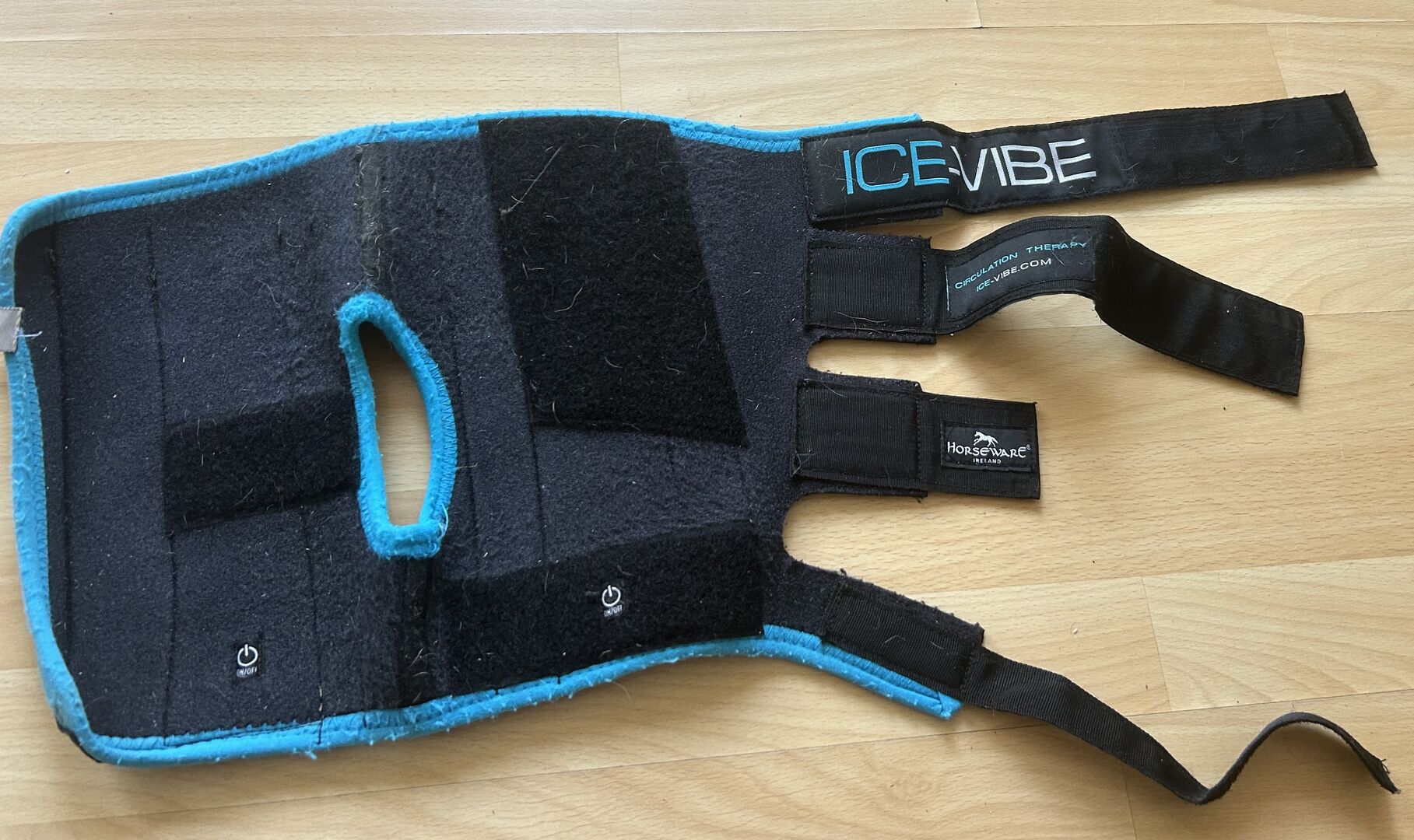 Horseware Ice-Vibe Hock Wrap, rozmiar Full - Na sprzedaż jest para Horseware Ice-Vibe Hock Wrap w rozmiarze Full. Owijki są w dobrym stanie i w pełni funkcjonalne. Sprzedawane są świeżo po praniu, ale może być na nich jeszcze trochę sierści.