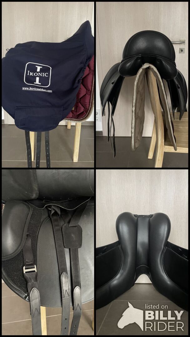 Ikonic Light Dressage 17 cali w doskonałym stanie - Sprzedam czarne lekkie siodło ujeżdżeniowe Ikonic o rozmiarze siedziska 17 cali. Duża klapa siodła oznacza, że nawet wysocy jeźdźcy znajdą dużo miejsca. Jest miękko wyściełane i ma stylowe patentowe detale. Płyta wpustowa może być zmieniana przez jeźdźca. Obecnie dostępne w rozmiarze MW. W zestawie znajduje się płyta wpustowa w rozmiarze M i pokazana podkładka pod siodło.