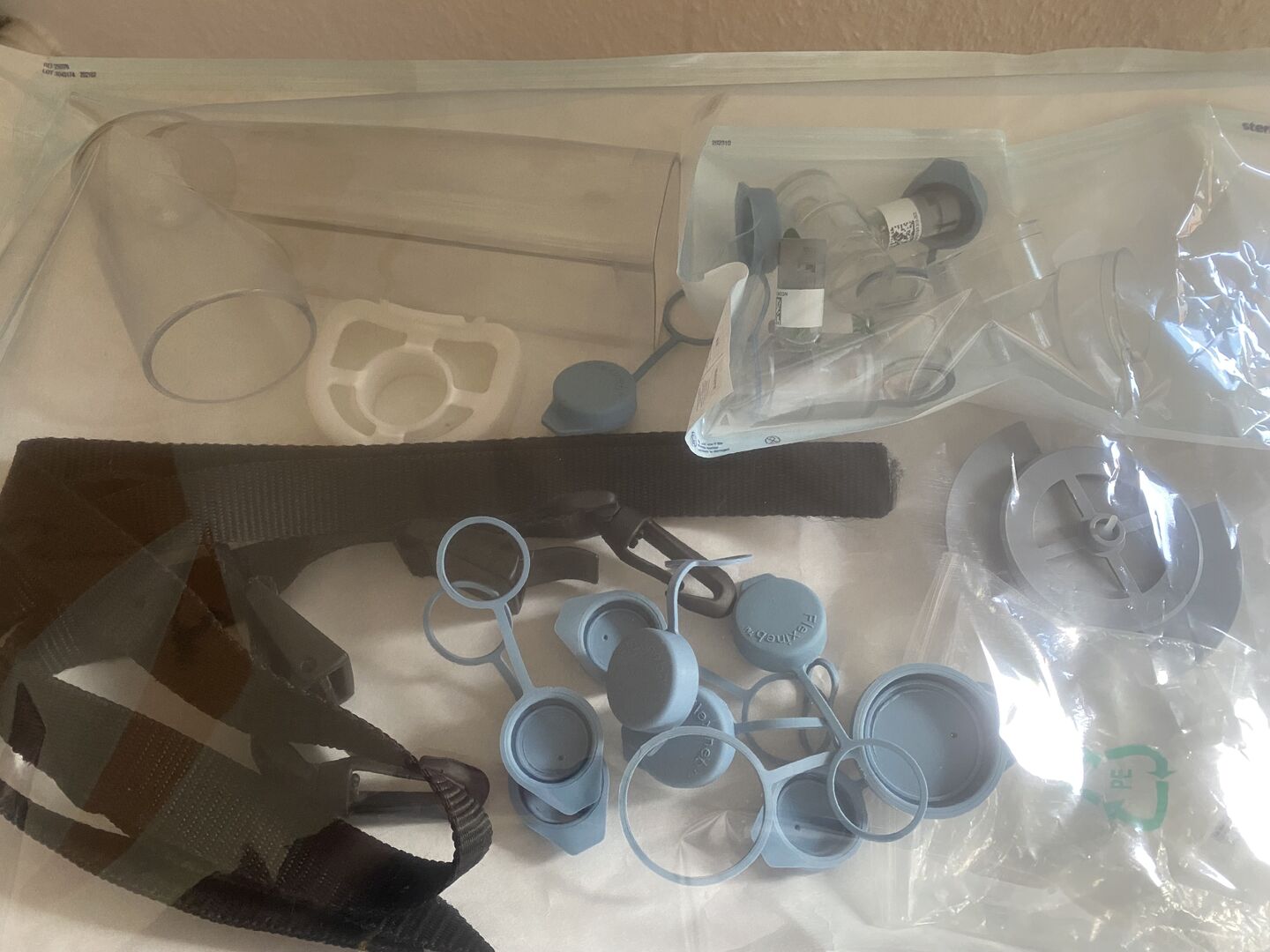 Brak wad , Ślady użytkowania na komorze mgły , Nebulizator 2A/E3 fast 2szt jak nowy , Zawór wylotowy nowy , Zawór wlotowy nowy , Jednostka przedłużająca 20ml , Pasek mocujący komorę aerozolową , Pasek mocujący z blokadą zaciskową , Paski mocujące do pierścieni mocujących , 1L solanki 1%
