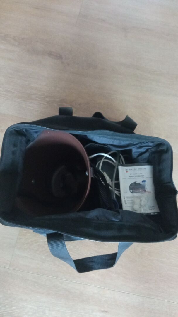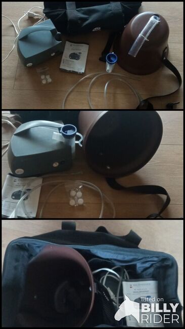 Inhalator do górnych i dolnych dróg oddechowych oraz do wdychania aerozoli leków głęboko do dróg oddechowych. Przyjazny dla koni i bardzo skuteczny. Zawiera Maska inhalacyjna/pojemnik zbiorczy, nebulizator i praktyczna torba do przechowywania. Inhalator jest czyszczony i dezynfekowany oraz w pełni funkcjonalny.