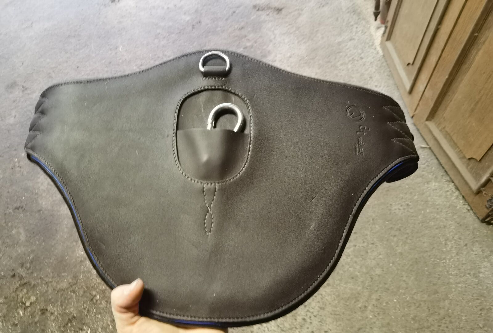 Jak nowy pas z knagą, 130 cm - Brązowy pas z ćwiekami od dt saddlery z niebieskimi wypustkami! Długość 130 cm Strona skierowana w stronę konia jest wykonana z prawdziwej skóry, co zapobiega podrażnieniom skóry. Strona zewnętrzna to Lemico, która jest niezwykle łatwa do czyszczenia. W celu zastosowania napierśnika lub kantara, karabińczyk jest mocno osadzony. Pasy były używane tylko raz, dlatego są w doskonałym stanie. Niestety, nie pasuje on idealnie do mojego konia pod względem długości.