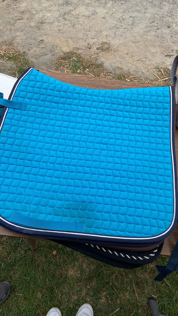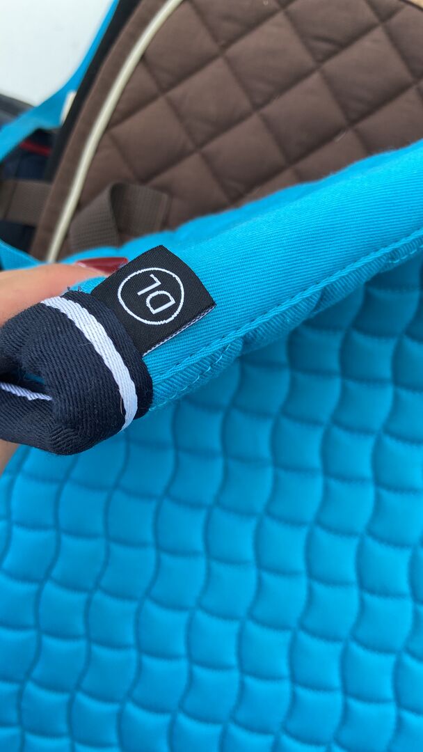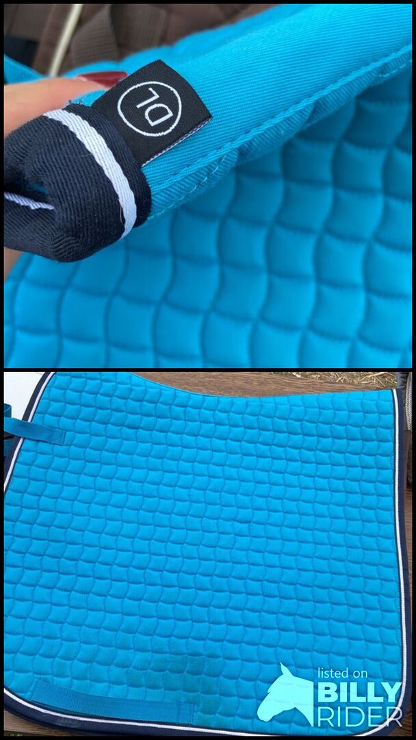 Jasnoniebieska bawełniana podkładka pod siodło Eskadron - Hej, sprzedaję moją prawie nieużywaną bawełnianą podkładkę pod siodło Eskadron. Umyłem go i usunąłem włosy, ale nadal widać niewielkie zużycie na popręgu.