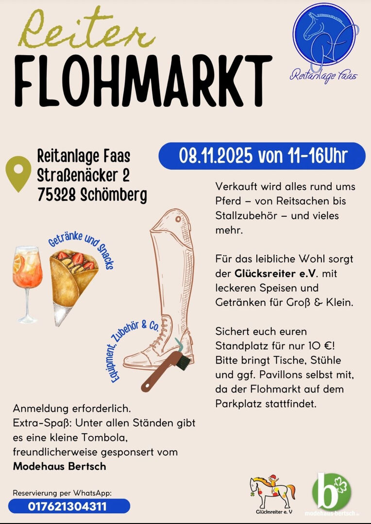 Jeździecki pchli targ 🐴 - W sobotę, 8 listopada 2025 r. w godzinach 11-16 na terenie ośrodka jeździeckiego Faas (Straßenäcker 2, 75328 Schömberg) odbędzie się wielki jeździecki pchli targ. W sprzedaży znajdzie się wszystko, czego zapragnie jeździec: sprzęt jeździecki, akcesoria dla konia i stajni - i wiele więcej. Glücksreiter e.V. zadba o Twoje dobre samopoczucie, oferując pyszne jedzenie, napoje i ciasta. Specjalna atrakcja: wśród wszystkich wystawców zostaną rozlosowane wspaniałe bony od Modehaus Bertsch! Stoiska można zarezerwować za 10 € (prosimy o przyniesienie własnych stołów/krzeseł/pawilonów). Wymagana jest rejestracja. Czekamy na wielu odwiedzających i wspaniały dzień z wami! Rejestracja i informacje przez WhatsApp: 0176 21304311