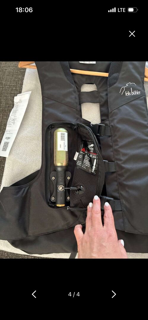 Kamizelka z poduszką powietrzną Felix Bühler - Sprzedaję moją kamizelkę z poduszką powietrzną od Felixa Bühlera, rozmiar L. Kamizelka została zakupiona 25.10.2025 (faktura dostępna, oryginalna nowa cena 380,00) i była noszona tylko raz. Nie była używana. Zawiera nabój gazowy.