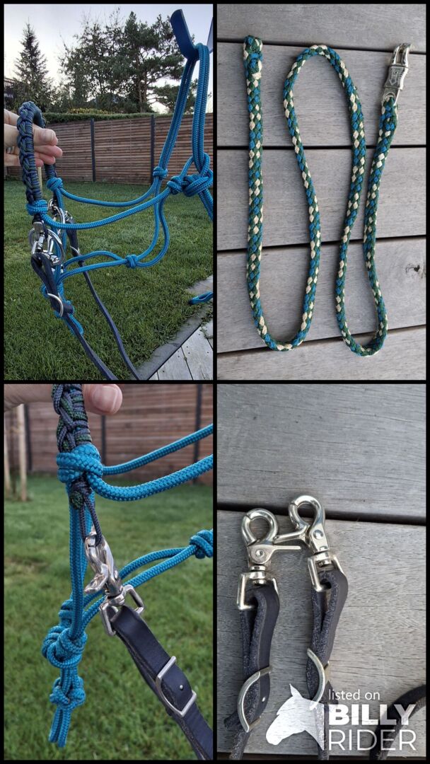 Kolor turkusowy/petrol, pasek na nos jest pleciony w kolorach jodłowej zieleni/granatu. W komplecie znajduje się wysokiej jakości natłuszczony skórzany popręg w kolorze granatowym oraz lina do wodzy w kolorze niebieskim/zielonym/beżowym (patrz zdjęcia).