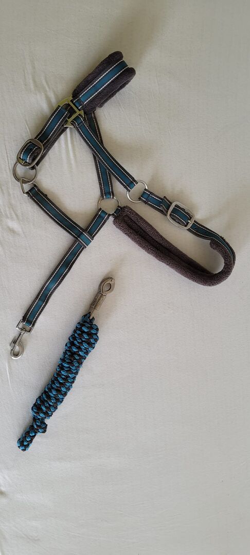 Kantar z futra kucyka z karabińczykiem, turkusowo-szary - Dobrze używany kantar dla kucyka ze zintegrowanym futerkiem za uszami i na nosie, w tym linka