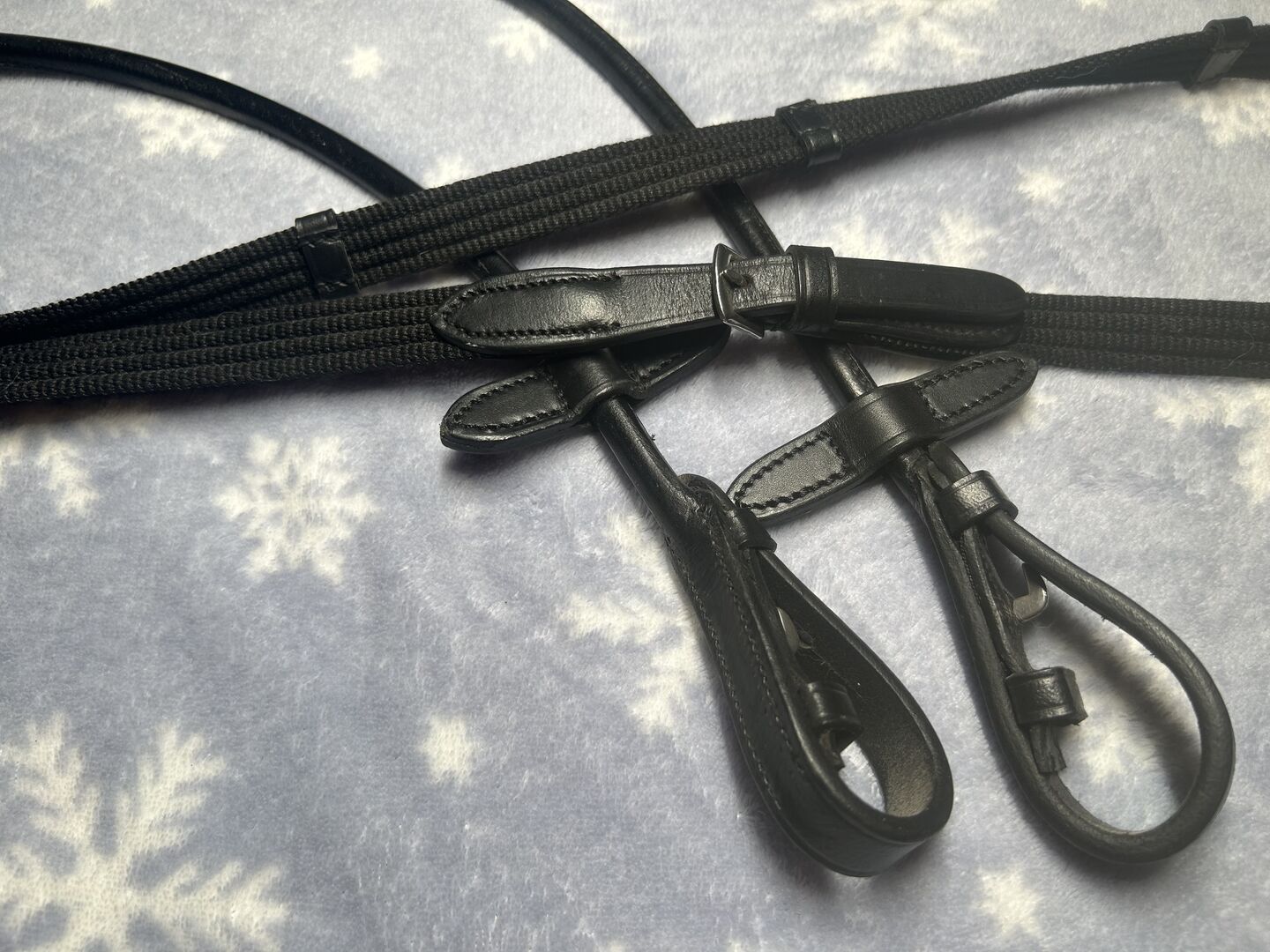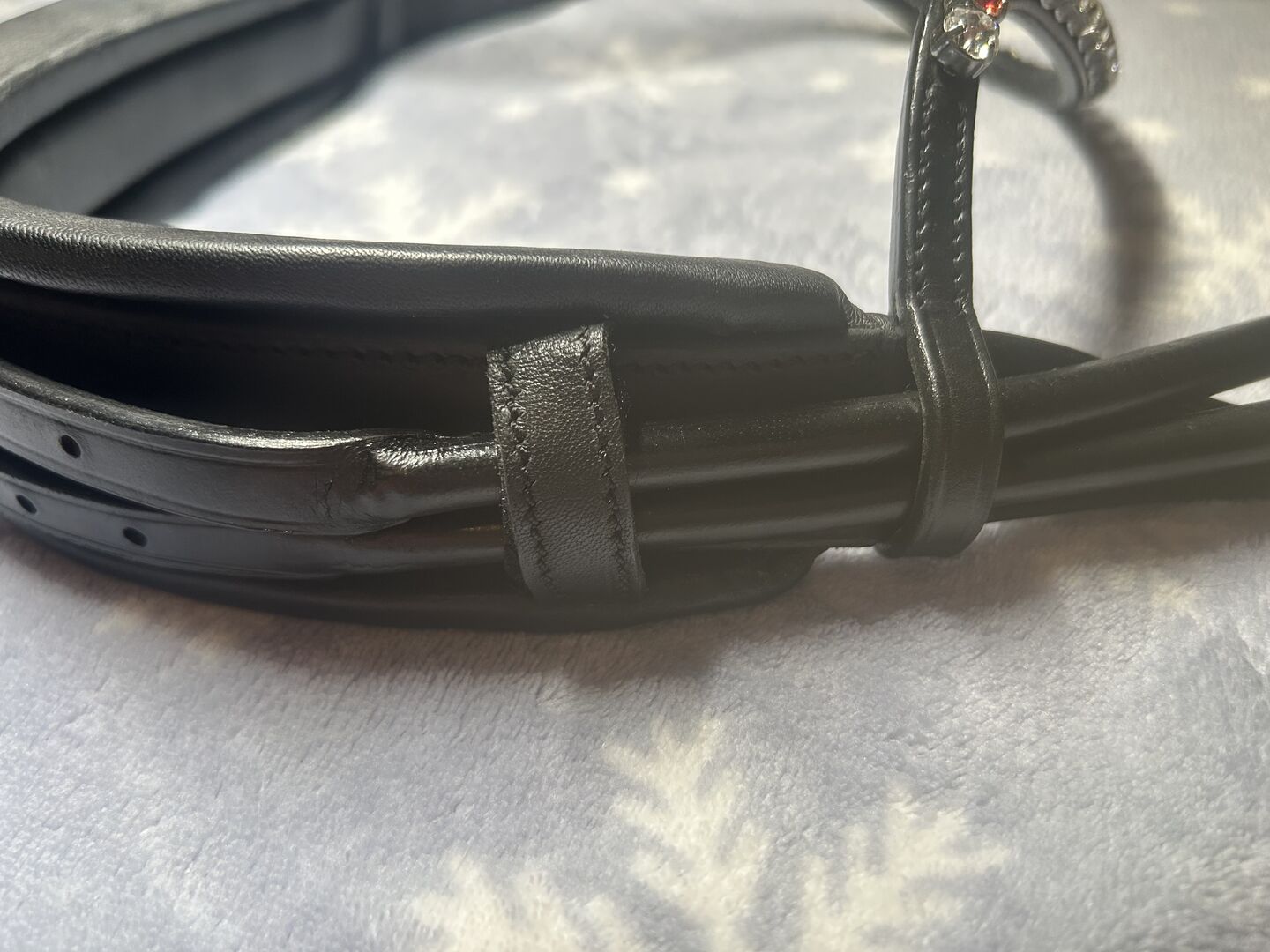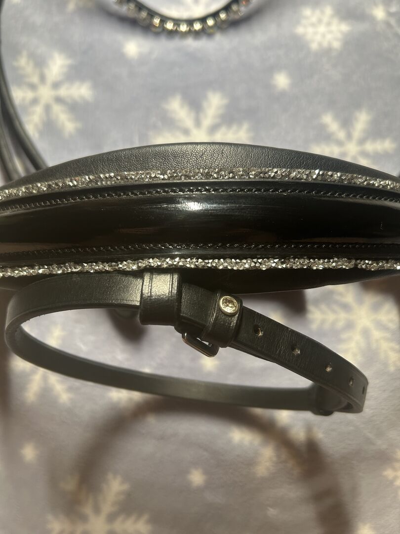 Karabińczyk SD z opaską Ivy Horse Fashion - Zmontowana uzda od SD-Design w rozmiarze WB. Uzda jest jak nowa (patrz zdjęcia) Jest szyta na okrągło, a pasek na nos wykonany jest z czarnej skóry lakierowanej ze srebrnymi kryształkami. Ma również prosty naczółek. Zamiast zwykłej opaski na czoło, jest wyposażony w opaskę na czoło Ivy Horse Fashion Slim z niestandardowymi kamieniami. Wodze są oczywiście również dołączone. Nowa cena bez opaski wynosi około 300 €, opaska kosztuje 80 €.