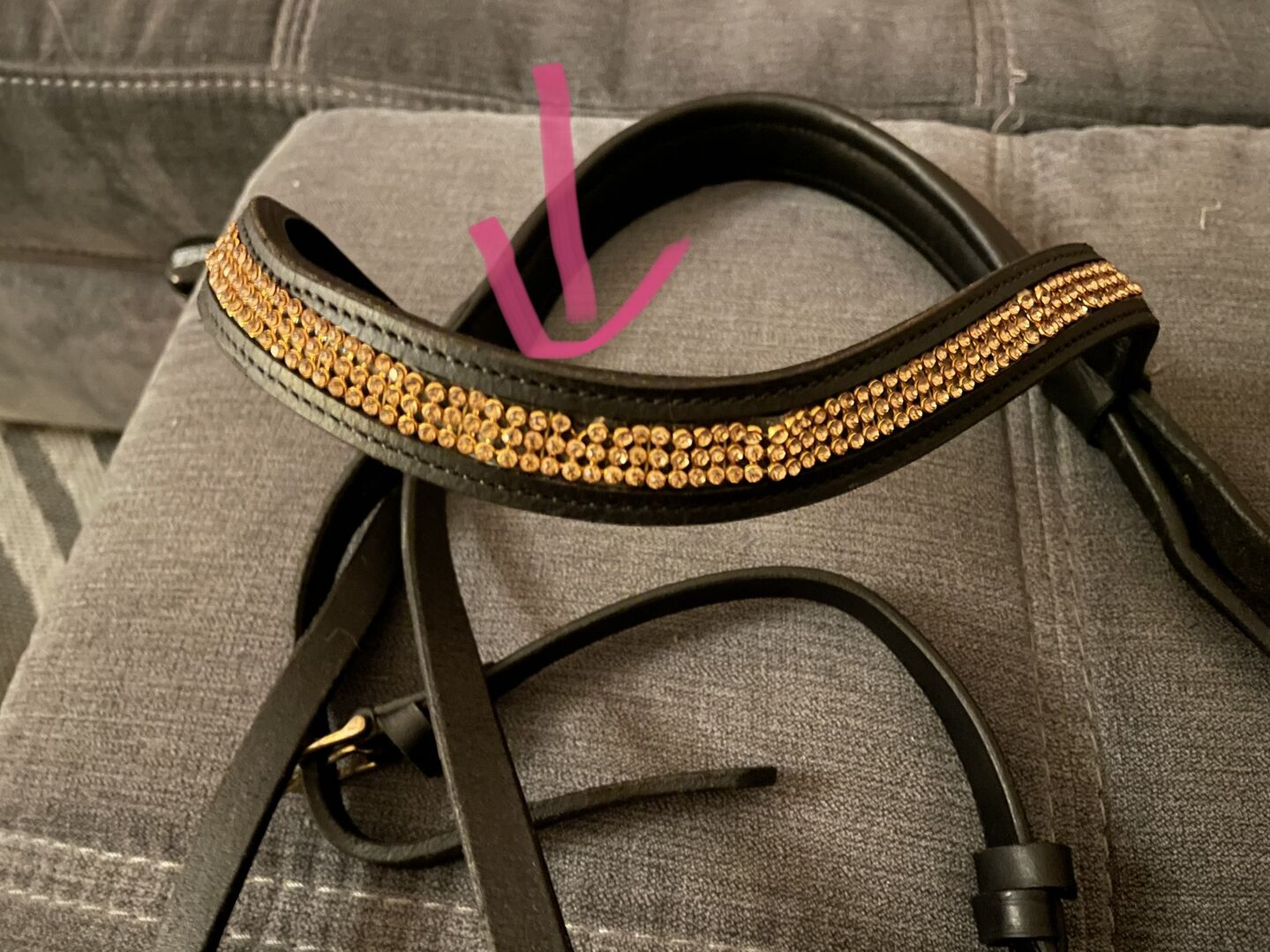 Karabińczyk WB ze złotymi okuciami - Kantar No Name. Pasuje do dużych rozmiarów. Z wędzidłami. Brakuje jednego kamienia, poza tym jest w dobrym stanie.