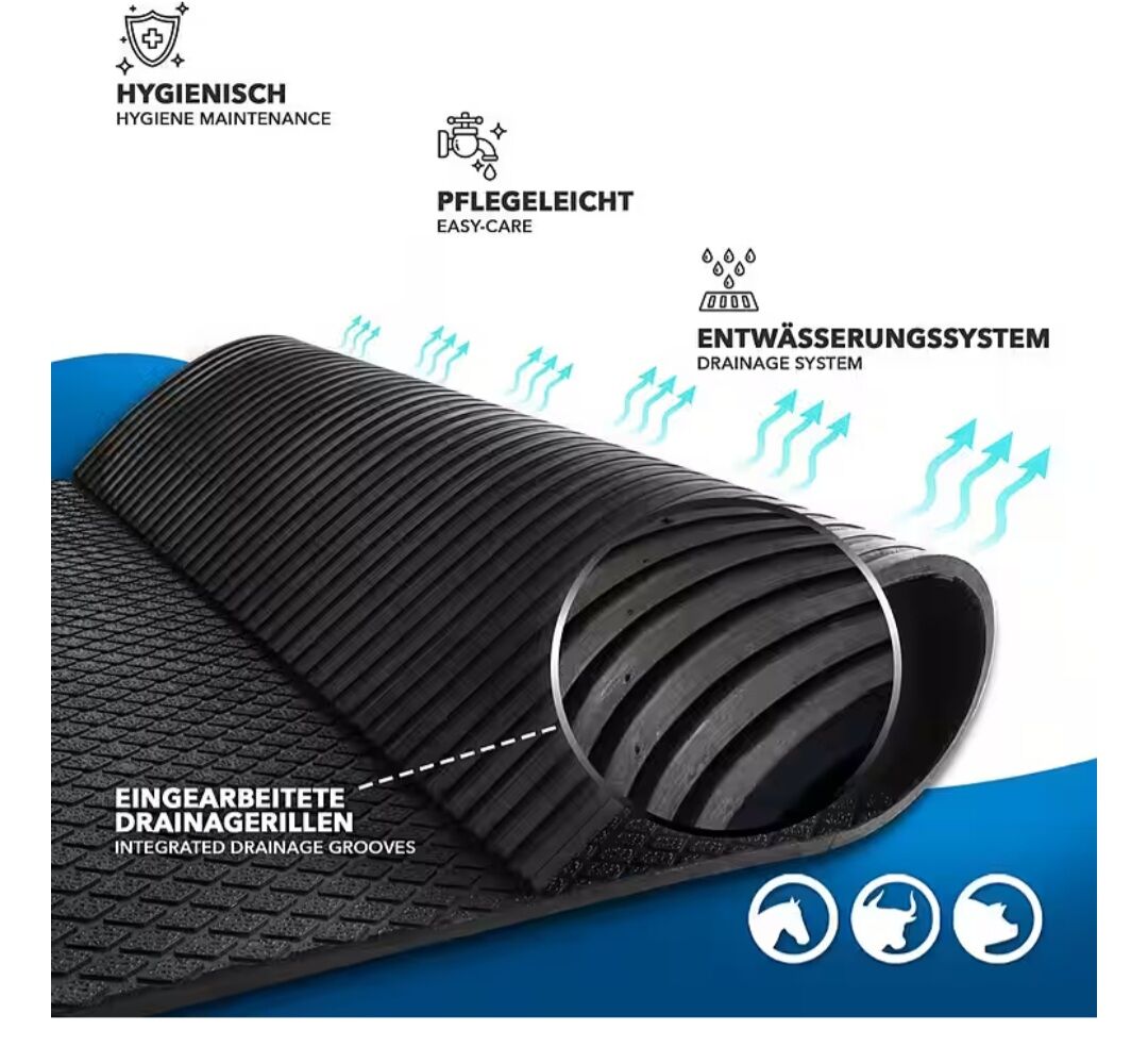 KARATOWE MATY GUMOWE DO STAJNI - - Stabilna mata wykonana w 80% z gumy pochodzącej z recyklingu i w 20% z kauczuku naturalnego - Łatwa do układania i antypoślizgowa powierzchnia - Do stajni, chodników, terenów zewnętrznych... - Ulga dla stawów + dobra przyczepność - Sprawdzona jakość Gumowa mata do stajni "Diamond Top" dla krów, świń i koni Odporna na zużycie mata stajenna wykonana z mieszanki gumy pochodzącej z recyklingu i kauczuku naturalnego jest idealna do wyposażenia obór dla krów, świń i koni. Przejścia do stajni, boksy, myjnie lub padoki można zatem ulepszyć za pomocą mat stajennych. Dzięki antypoślizgowej powierzchni zwierzę znajdzie optymalne oparcie nawet w mokrych warunkach, minimalizując ryzyko obrażeń. Efekt izolacyjny maty stajennej sprawia również, że podłoga jest przyjemnym miejscem dla krów, świń lub koni. Odciążająca i przyjazna dla stawów powierzchnia Struktura powierzchni zapewnia nie tylko pewny chwyt podczas chodzenia, ale także ogromny komfort, gdy zwierzęta stoją lub leżą. Dzięki odciążającemu gumowemu materiałowi stawy zwierząt są chronione, a ich samopoczucie ulega poprawie. Stabilna mata wytrzymuje zatem duże obciążenia, zapobiega poważnym urazom i zmniejsza stres. Zintegrowane rowki drenażowe umożliwiają również skuteczne odprowadzanie wody i płynów, dzięki czemu stajnia pozostaje czysta i sucha. Zintegrowane rowki drenażowe jako idealny system odprowadzania wody Funkcja drenażu jest szczególnie korzystna w przypadku hodowli zwierząt lub użytkowania na zewnątrz. Wbudowane z tyłu rowki umożliwiają szybkie i skuteczne odprowadzanie wody, zapobiegając jej gromadzeniu się podczas deszczu lub zamoczenia. Jest to również zaleta podczas czyszczenia za pomocą węża z wodą. Maty gumowe pozostają niezawodnie na swoim miejscu dzięki dużej masie własnej. Stabilna mata "Diamond Top" - Cechy produktu: - Materiał: 80% gumy z recyklingu i 20% kauczuku naturalnego - Wymiary produktu: 180 x 120 cm - Waga: 37 kg - Grubość: 17 mm - Higieniczna i łatwa do czyszczenia - Ze zintegrowanymi rowkami drenażowymi - Antypoślizgowa struktura powierzchni - Stopień twardości: 60+/-5A - Wytrzymałość na rozciąganie do 4 MPa - Odporność na temperaturę: -20°C do +80°C