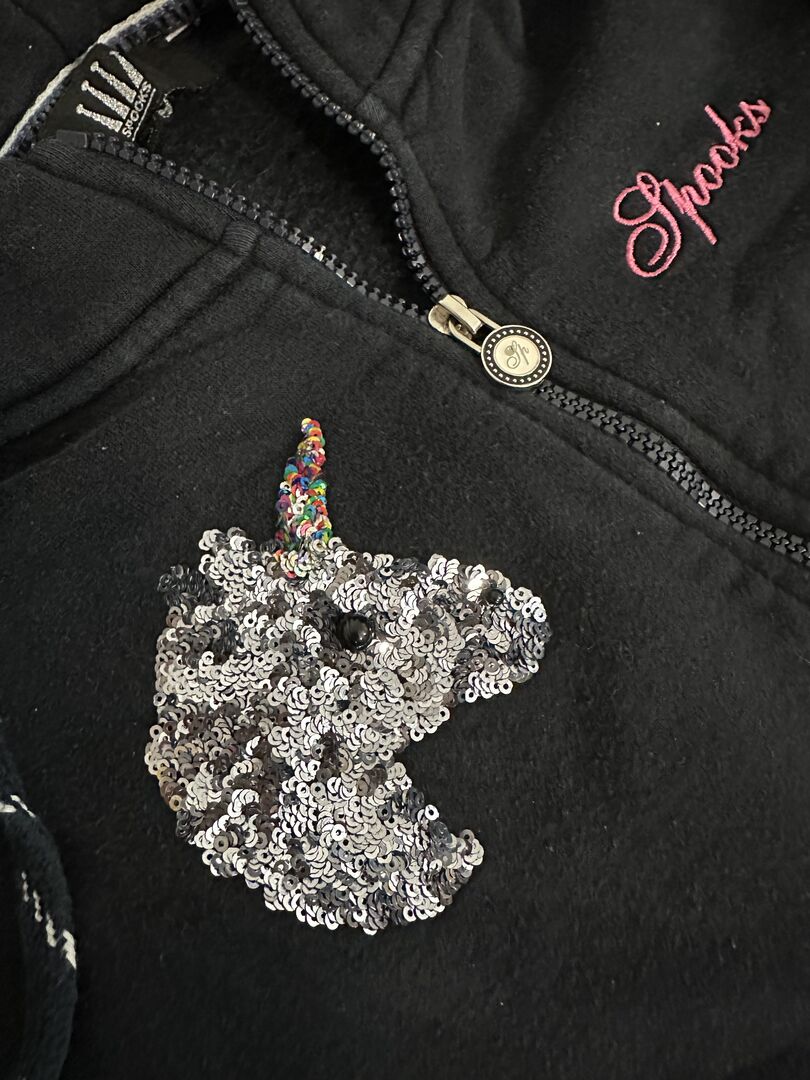 Kardigan Spooks granatowy XS - Granatowy kardigan od Spooks w rozmiarze XS. Zamek błyskawiczny działa idealnie. Z przodu jednorożec z cekinów. Różowe detale.