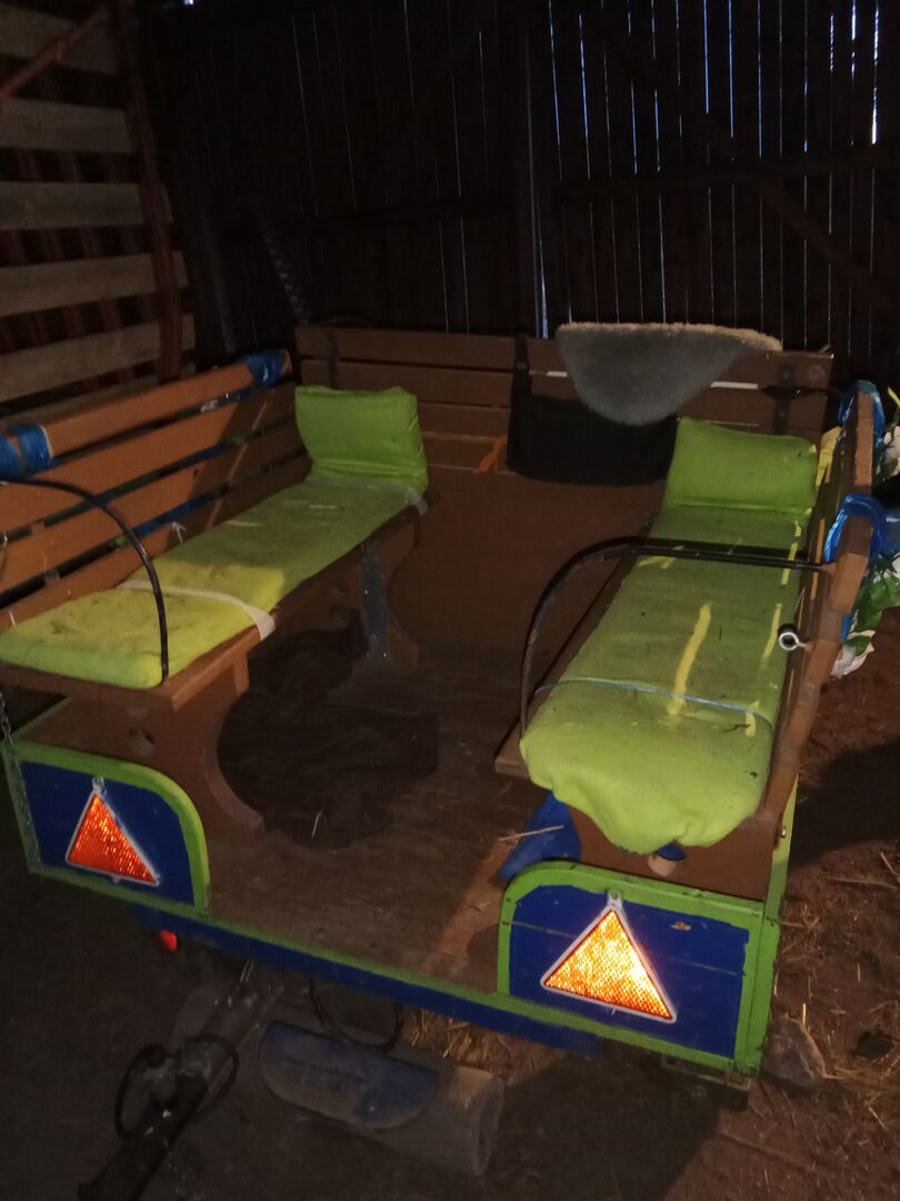 Karetka Shetty - Dobrze zachowany dwukonny powóz Shetty. Z hamulcem bębnowym, który jest obsługiwany za pomocą hamulca nożnego. Powóz jest bardziej odpowiedni do użytku terenowego i rekreacyjnego. Jest zawsze suchy i gotowy do natychmiastowego użycia. Można go łatwo przemalować. Długość 1,80 m Szerokość 1,10 m Wysokość kozła 1m