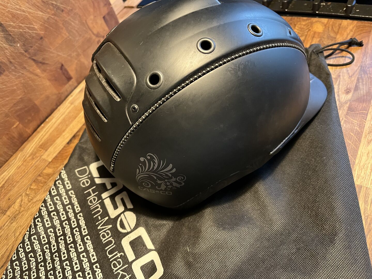 Kask jeździecki Casco czarny z dekoracją - Kask jest piękny i lekki. Jest regulowany we wkładce za pomocą kółka i dobrze dopasowuje się do kształtu głowy. Był noszony tylko na turnieju w jednym sezonie (2023) i jest w absolutnie najlepszym stanie.