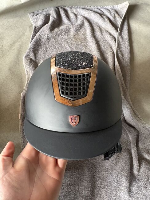 Kask jeździecki Equestro rozmiar L - Kask był tylko przymierzany. Zakupiony od Loesdau. Niestety zbiera kurz i nie jest używany. Nowa cena wynosiła 140€