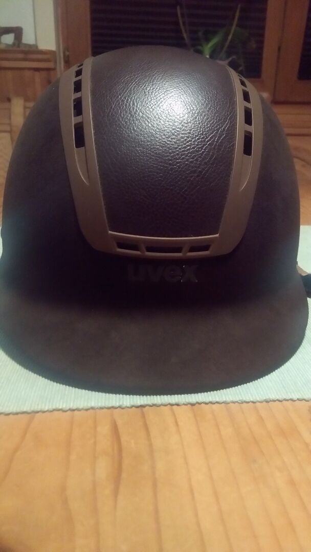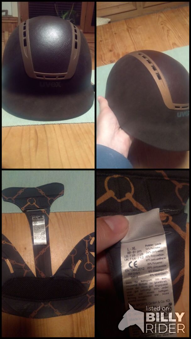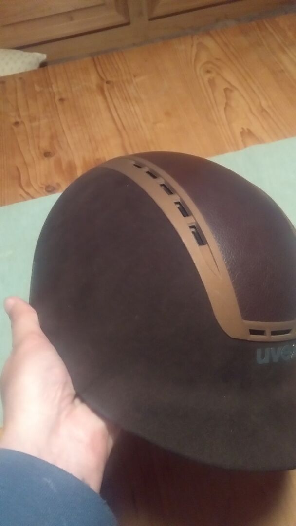 Kask jeździecki uvex brązowy - Ładny kask Nie ma żadnych wad Bezwypadkowy Wkładka do wyjęcia Skórzana wyściółka i wyściółka nieco w użyciu Osłonę podbródka można również zdjąć