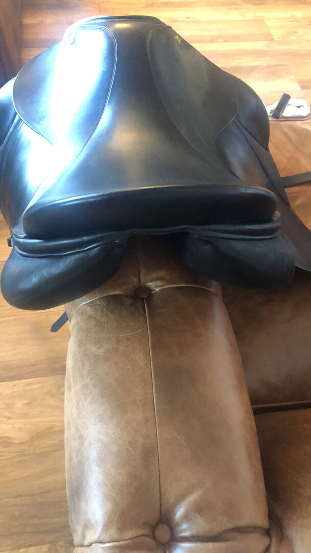 18” wide black English leather dressage saddle. Ideal for the big horse, very wide at the back and gives lots of room for the broader shoulder. Beautiful saddle, like new.