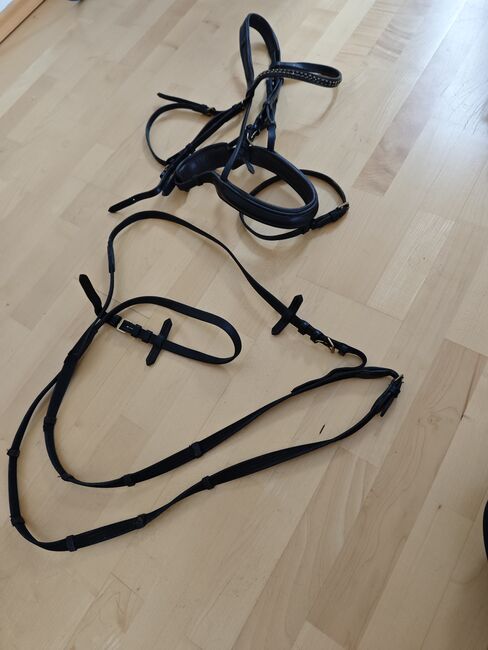 Kieffer Snaffle WB - Sprzedam w bardzo dobrym stanie uzdę Kieffera wraz z wędzidłami w rozmiarze WB. Uzda ma czarne kamienie ze złotymi zdobieniami na pałąku. Skóra jest czarno-brązowa.