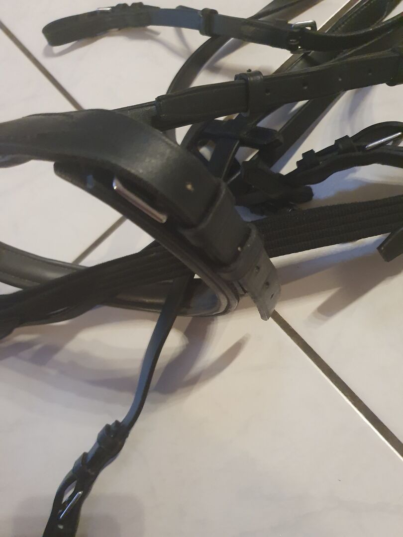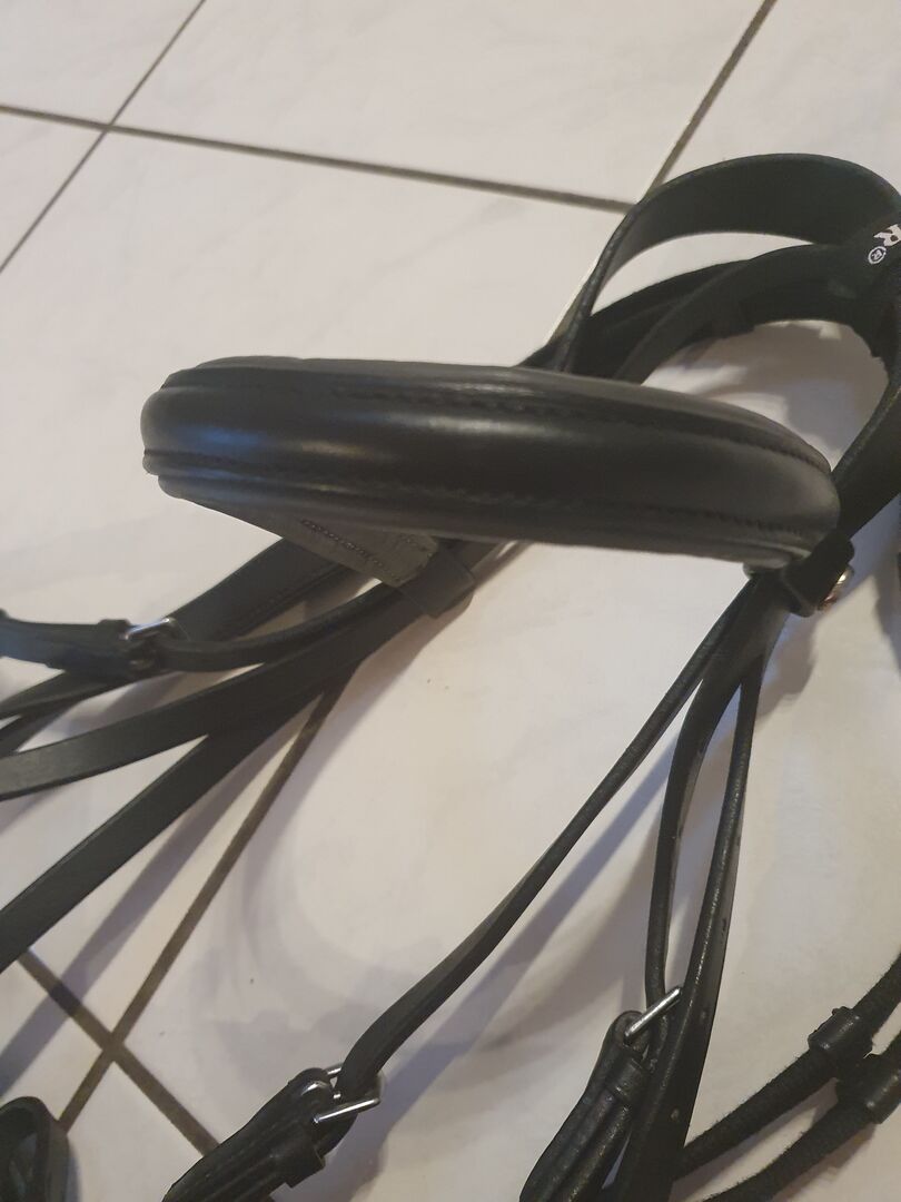 Uzda była używana może 20 razy i była czyszczona prawie po każdym użyciu, więc jest bardzo zadbana. Pasek na czoło i nos mają szarą wyściółkę. Nie wiem, czy reny są oryginalne, w tamtym czasie nazwa marki nie była jeszcze wytłoczona na sprzączkach. W międzyczasie pojawił się pasek blokujący, który jest oczywiście dołączony do zestawu.