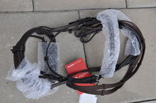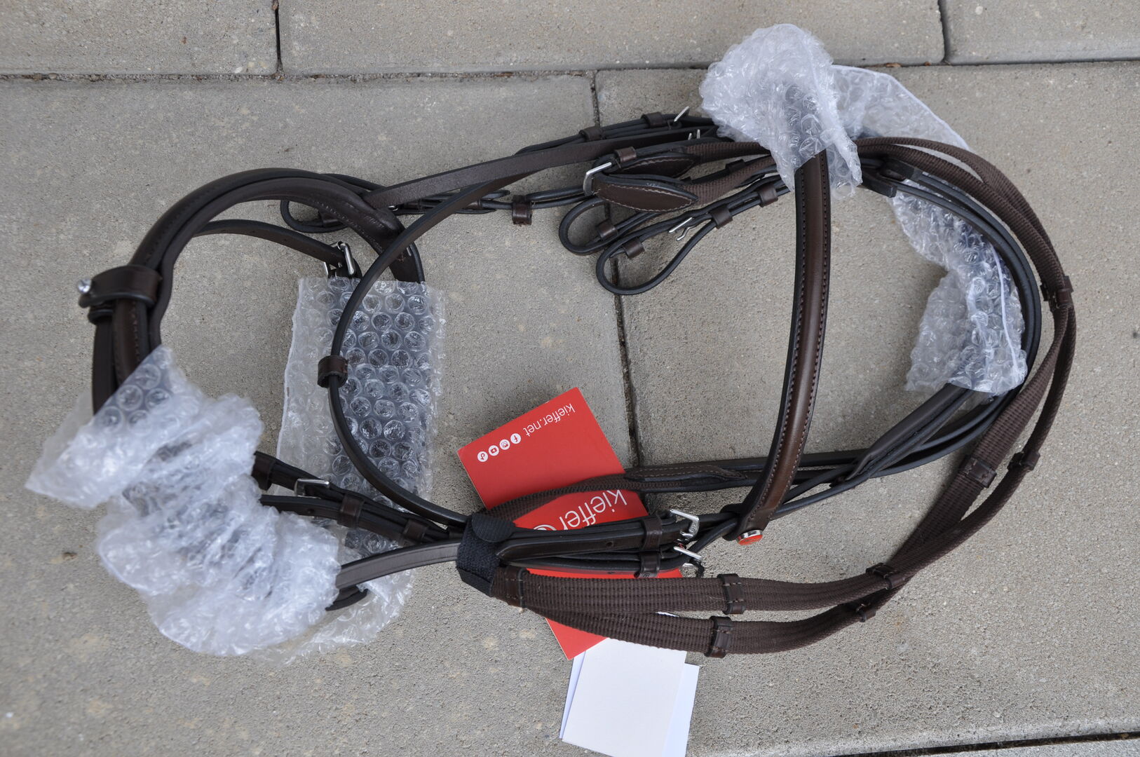 Kieffer uzda snaffle wąska ANJA BERAN w kolorze brązowym VB - Na sprzedaż uzda Kieffer wąska ANJA BERAN w kolorze brązowym Kolor brązowy w rozmiarze COB/Fullblood (Zdjęcie z koniem jest czarne, ale tylko po to, żeby dobrze było widać uzdę)
