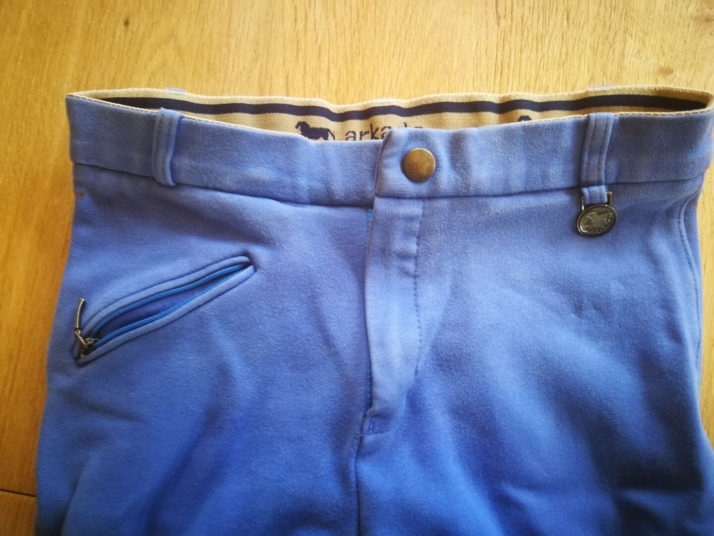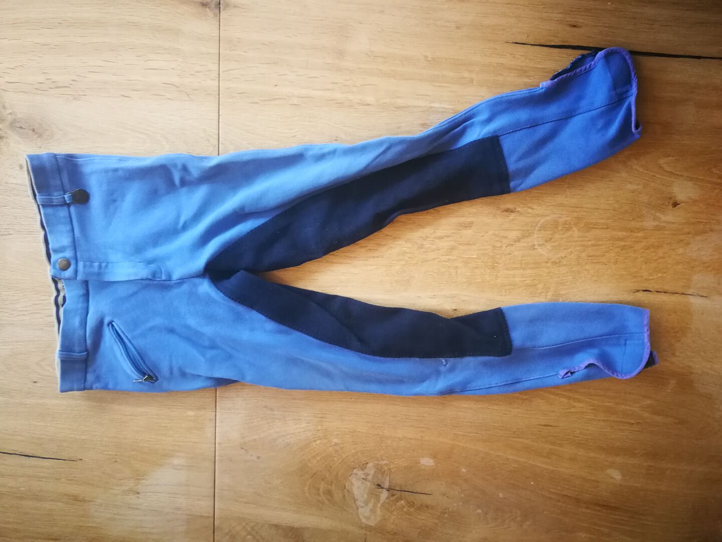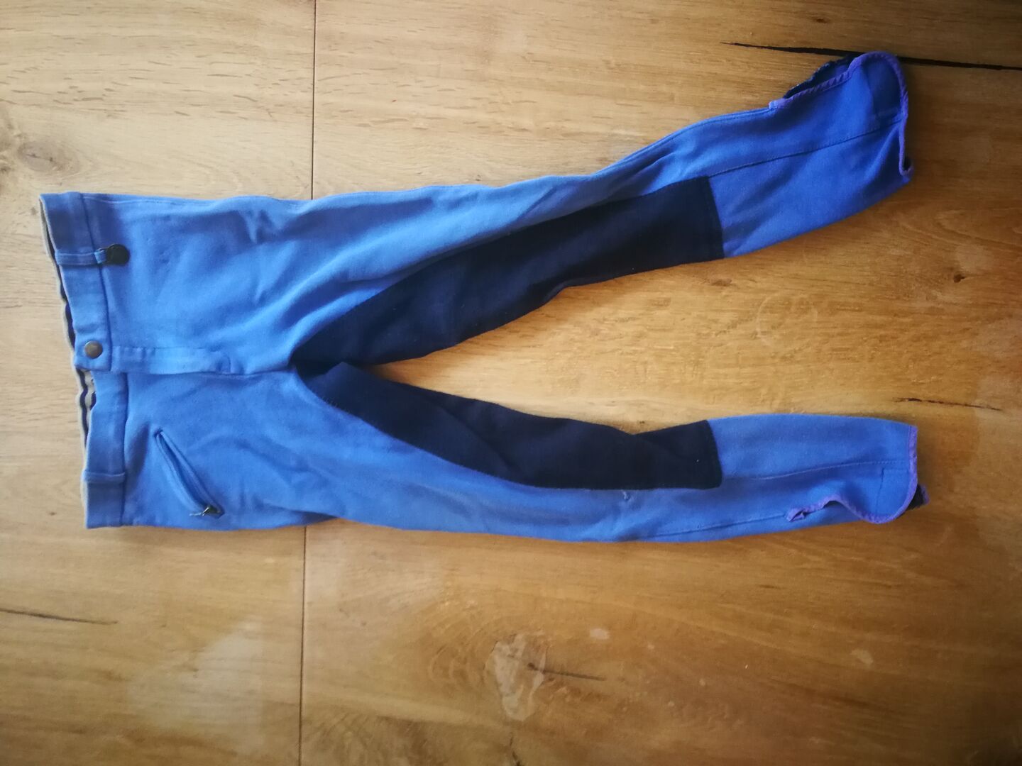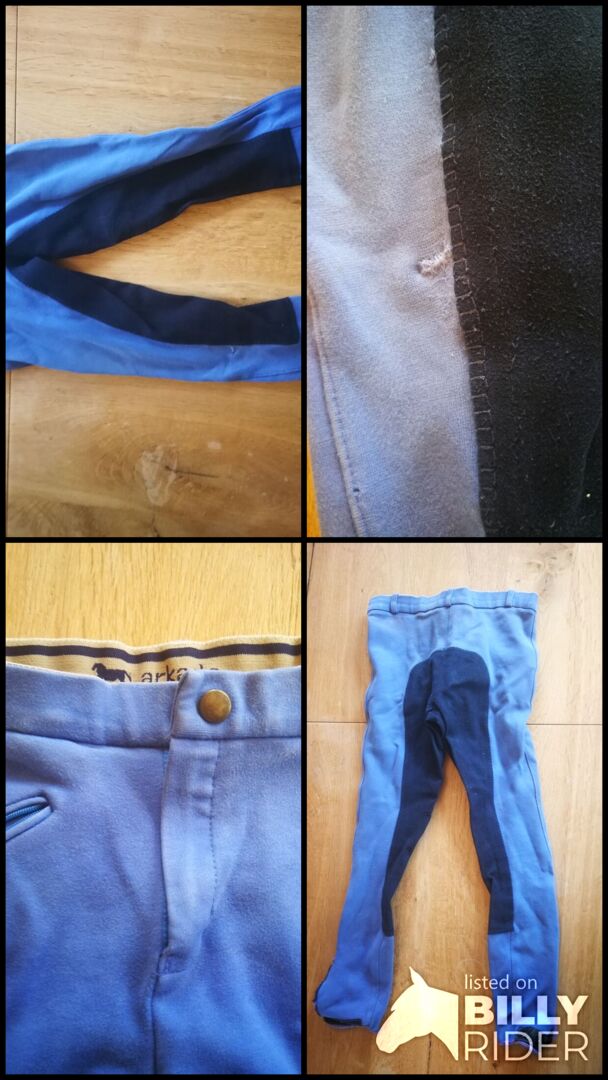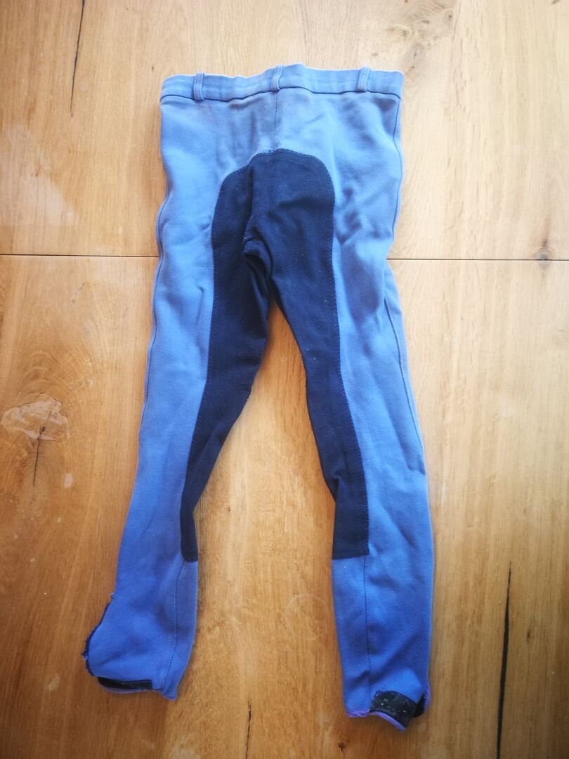 Piękne niebieskie bryczesy dziecięce rozmiar 140, raz zostały przeszyte na kolanie (patrz zdjęcie), nadal w dobrym stanie :)