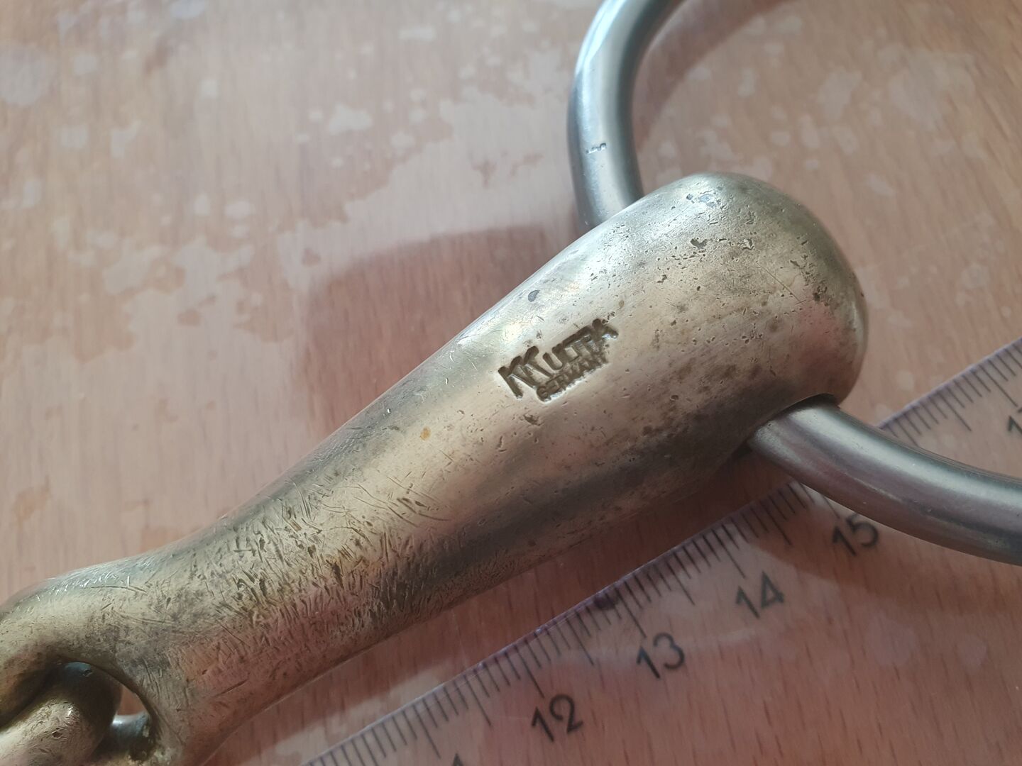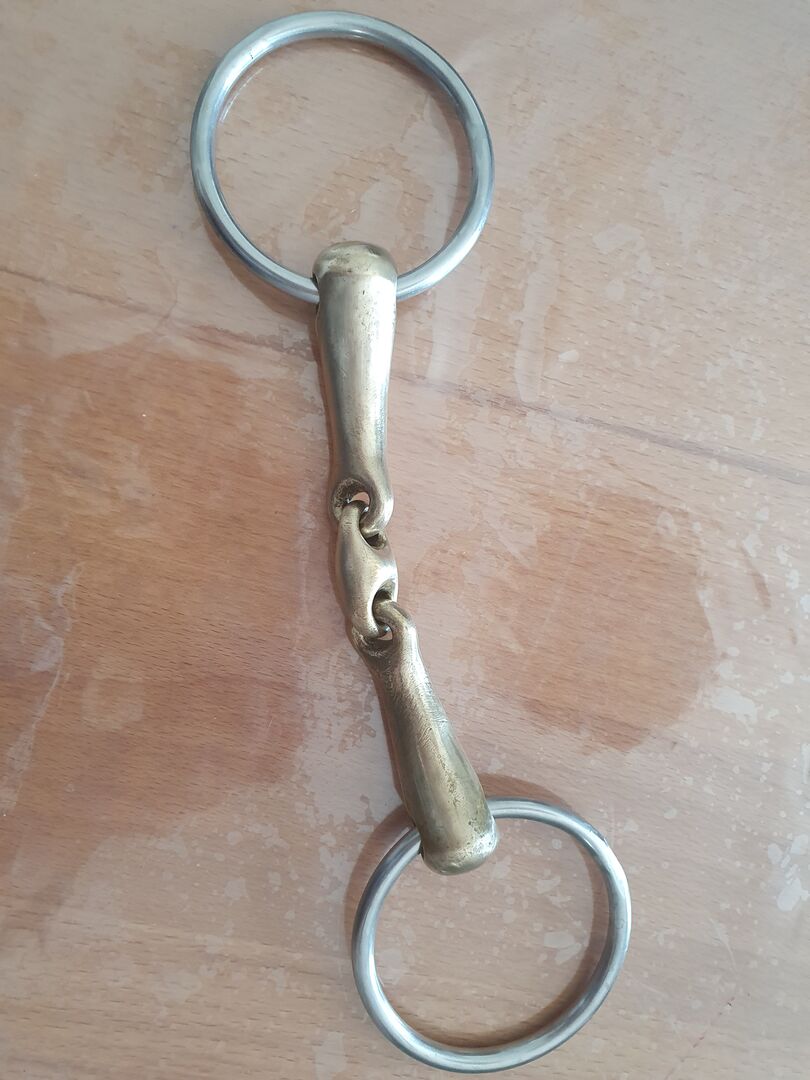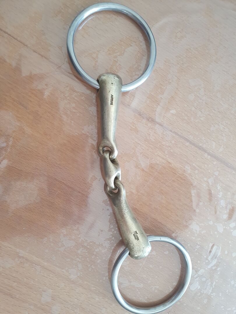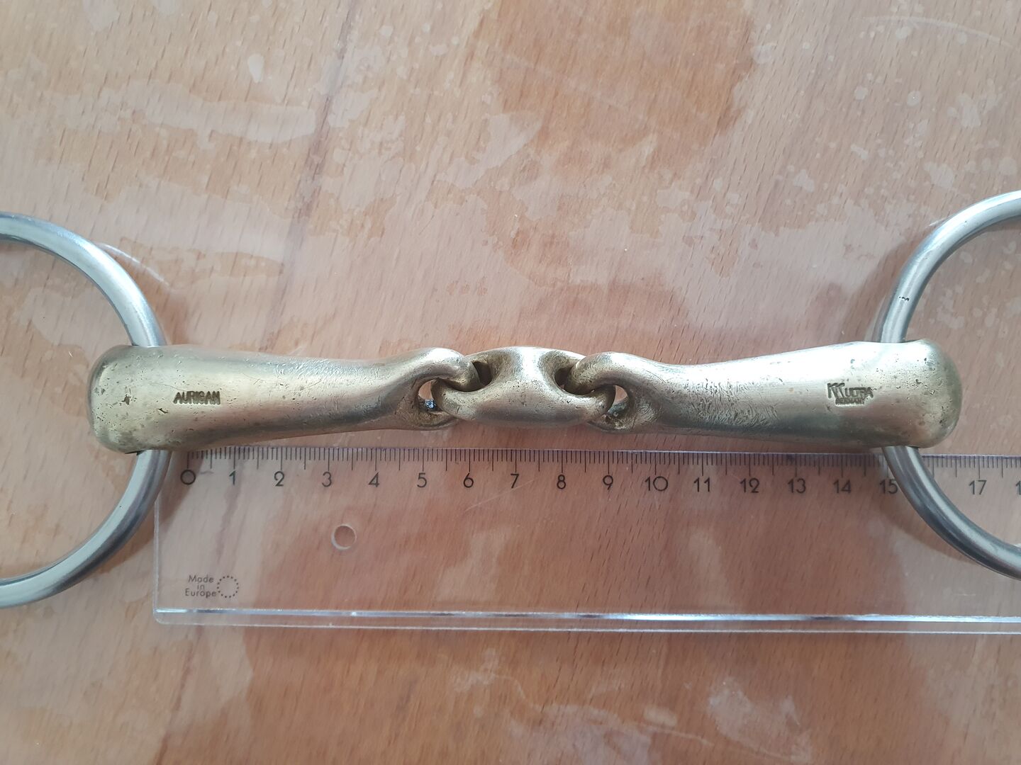 KK Ultra Bit od Sprenger, podwójnie łamany - Sprzedam używany podwójnie łamany bit KK-Ultra firmy Sprenger wykonany z Aurigan z pierścieniami wykonanymi ze stali nierdzewnej. Ma szerokość 14,5 cm i grubość około 21 mm. Widać na nim ślady użytkowania, ale nie ma ostrych krawędzi.