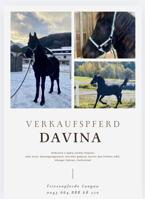 Davina jest bardzo poprawnie zbudowana i ma dużo popędu z zadu. Nowoczesny, elegancki młody koń o doskonałym ruchu.