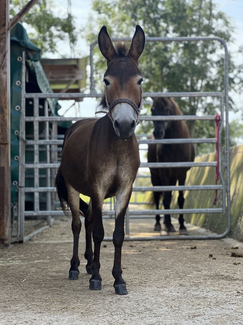 Klacz muła - Szukam dobrego miejsca dla mojego 3-letniego muła Pauline. Jest zaczipowana i ma paszport. Mam ją z centrum ratunkowego od około roku. Niestety z powodów osobistych nie mam już dla niej czasu. Zna halter i może być prowadzona, ale jest bardzo nieufna wobec obcych. Jest nieśmiała i nabierze zaufania dopiero po jakimś czasie i dużej pracy. Może być pielęgnowana do poziomu brzucha, wszystko poniżej i kopyta są problemem. Chciałabym dla niej dobre miejsce - a najlepiej opiekuna z dużą cierpliwością. Proszę o kontakt na 06604600403