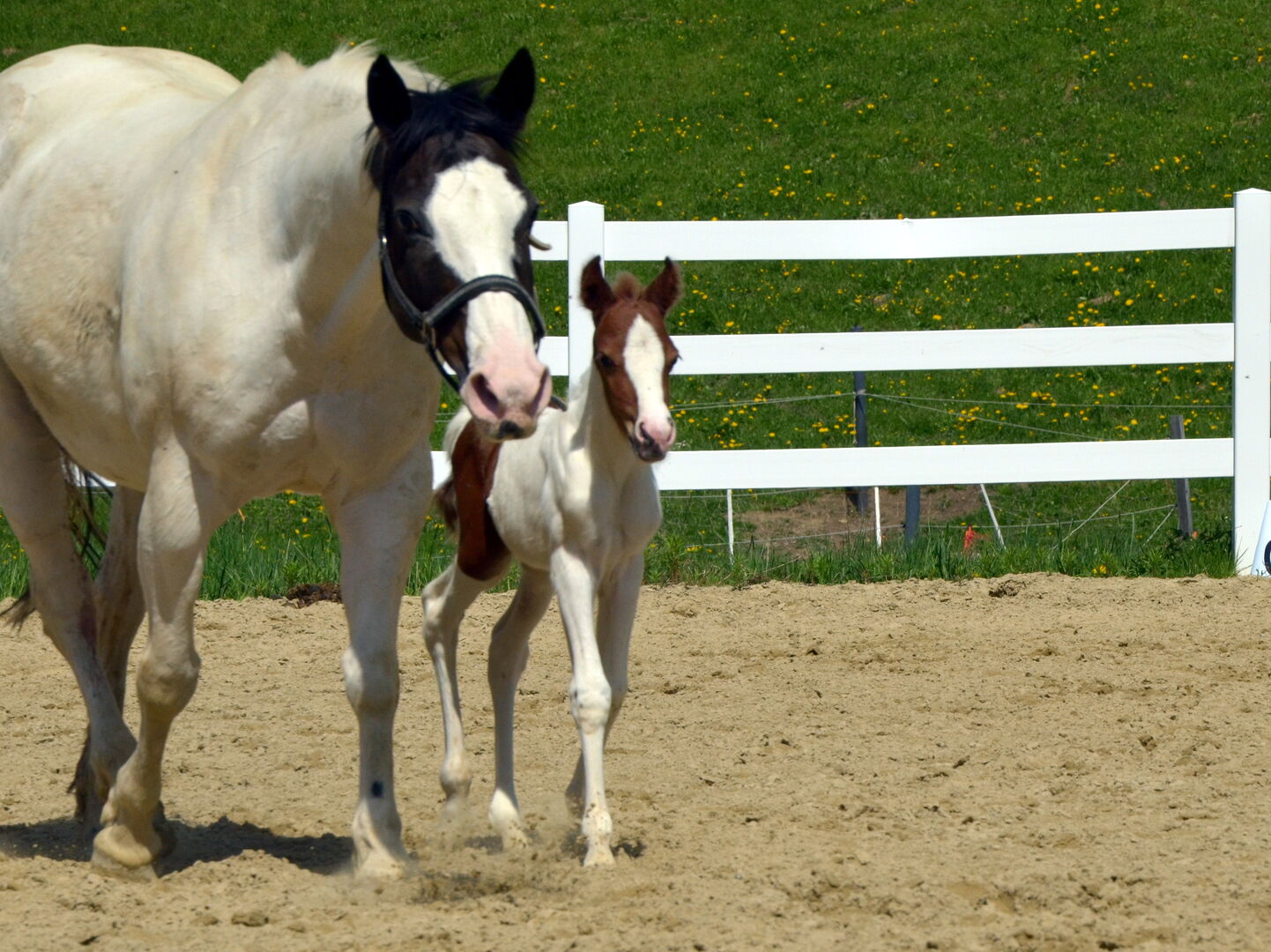 Klacz rasy Painthorse, dwuletnia - Daisy jest przyjazną, zorientowaną na człowieka klaczką, która chce się podobać. Lubi być głaskana i pielęgnowana bez ograniczeń. Dobrze kopytkuje, została już załadowana i sama chodzi z nami na spacery.