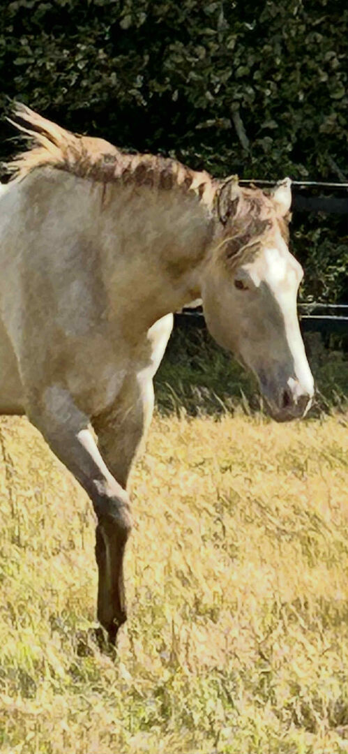 Klacz rasy Quarter Horse o wyjątkowym umaszczeniu i wspaniałym charakterze - Lokalizacja: 23714 Malente Cheyennes Marie Vudu - piękna klacz rasy Quarter Horse, urodzona 17 kwietnia 2024 r. Nosi niezwykły i rzadki kolor Classic Dun Champagne i jest homozygotycznie czarna według testu koloru - ekscytująca cecha, która czyni ją również interesującą do hodowli. Jej spodziewany ostateczny wzrost to ok. 151 cm. Jest prawidłowo zbudowana, dobrze rozwinięta i już umięśniona jak na swój wiek. W 2024 r. przeszła niewielką ogólną kontrolę stanu zdrowia - jej stan zdrowia jest normalny, jest regularnie odrobaczana i szczepiona, jest dobrze wychowana i nieskomplikowana u weterynarza i kowala. Vudu dorasta w środowisku odpowiednim dla gatunku, jest przyzwyczajona do przebywania w otwartych stajniach i boksach, a obecnie mieszka z trzema innymi klaczami w zgranej grupie. Dobrze się socjalizuje i jest raczej niska w hierarchii. Jest bardzo zorientowana na ludzi, przyjazna i otwarta. Do nowych sytuacji podchodzi z ciekawością i zainteresowaniem, dobrze zachowuje się na co dzień, dobrze radzi sobie z halterem i ma niezawodną znajomość podstaw źrebienia. Ma pozytywną charyzmę, jest chętna do nauki i uważna - to najlepsze warunki do solidnego dalszego treningu. Dzięki dobremu, wszechstronnemu rodowodowi idealnie nadaje się jako przyszły koń wierzchowy do rekreacji lub zawodów. Vudu łączy w sobie charyzmę, wnętrze i budowę - co czyni ją obiecującym młodym koniem z doskonałymi podstawami na przyszłość.