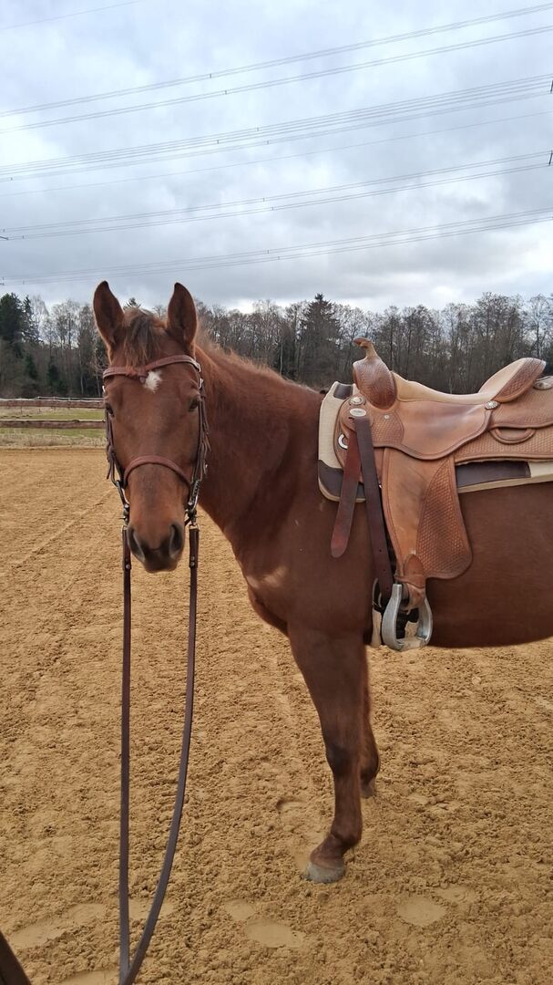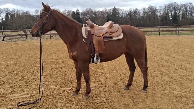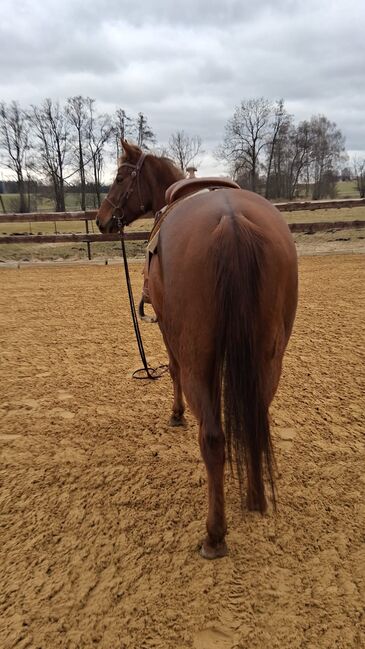 Klacz rasy Quarter Horse z charakterem i potencjałem do cuttingu i na ranczo - Lokalizacja: 85774 Unterföhring Joy Tee Rey to piękna klacz rasy Quarter Horse, urodzona 21.03.2021 r., o wzroście ok. 153 cm. Jest prawidłowo zbudowana, dobrze umięśniona i zdrowa, z ośmioma zdjęciami rentgenowskimi z 2024 r. Resi jest testowana na 6 panelach n / n i regularnie szczepiona i odrobaczana. Klacz mieszka w otwartej stajni w mieszanym stadzie, ale jest również zaznajomiona z boksami z padokami. Jej charakter jest wrażliwy, zorientowany na ludzi i ciekawy, ale raczej cichy i trochę leniwy. Zależy jej na regularnej pracy, ale potrzebuje odpowiedniego nacisku podczas pracy, ponieważ przy zbyt dużym nacisku staje się spięta. Nie nadaje się dla początkujących - idealna dla doświadczonych jeźdźców z doświadczeniem z młodymi końmi. Resi przeszła solidny podstawowy trening westernowy i jest już w pełni wyszkolona. Umie jeździć w crossie, w terenie jako koń wierzchowy i pod siodłem. Klacz dużo pracowała z ziemi. Dzięki bardzo dobremu rodowodowi do cuttingu idealnie nadaje się do klas cuttingowych i ranczerskich. Jej ojcem jest z powodzeniem pokazywany Titanium Toy, syn Metallic Cat. Po stronie matki jest wnuczką Dual Rey. Posiada papiery AQHA. Joy Tee Rey to idealny koń dla kogoś, kto chce zachęcić i rozwinąć młodego, wymagającego konia.