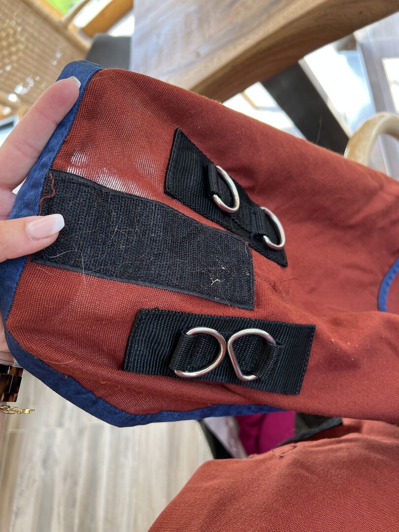 Koc dla konia w kolorze rdzy z paskiem na brzuch - Sprzedam prawie nową derkę dla konia. Derka jest wyposażona w regulowane paski na brzuch, pasek na klatkę piersiową, pasek na ogon i paski na nogi. Rozmiar na załączonym zdjęciu.