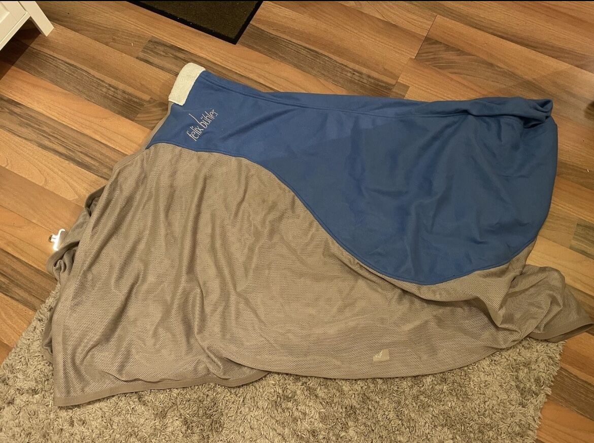 Koc kombinowany z polaru/polaru - Oferuję mało używany koc kombinowany firmy Felix Bühler. Góra wykonana jest z polaru, aby utrzymać ciepło pleców, a dół z materiału chroniącego przed muchami i co. Rozmiar 145 cm