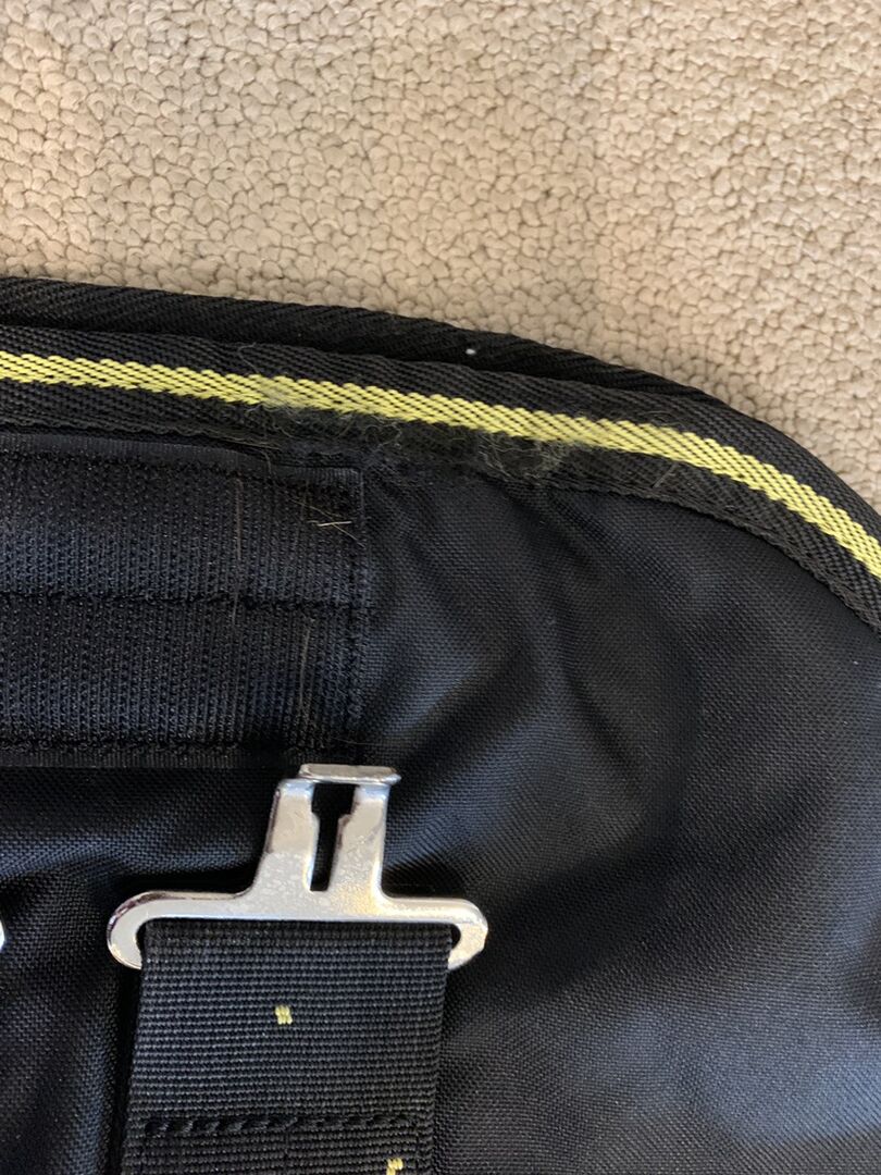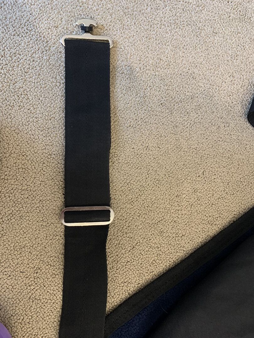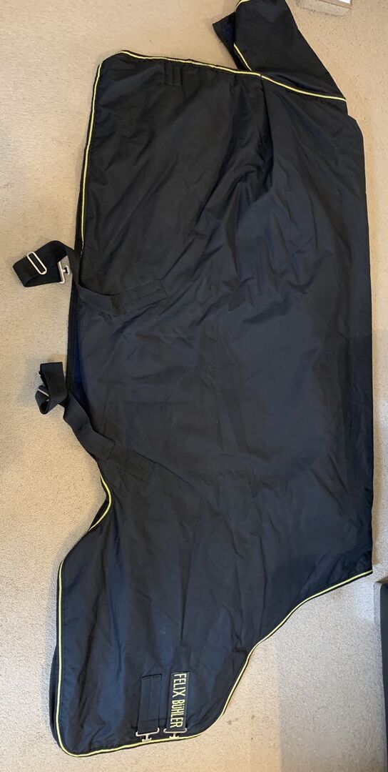 Koc outdoorowy 200g - Kocyk ma długość 125 cm, od wewnątrz jest wyściełany polarem i jest nieprzemakalny. Był na koniu przez maks. 2 tygodnie, potem został umyty i od prawie 3 lat leży w magazynie, ponieważ od tego czasu go nie używam. To jest zbyt dobre, aby leżeć bezczynnie. Koc nie ma dziur. Wewnątrz nadal znajduje się kilka włosów, ponieważ podszewka jest wykonana z polaru. Zewnętrzna strona koca jest lekko poplamiona (prawdopodobnie plamy z wody po praniu). Pasek na ogonie nie został całkowicie oczyszczony podczas mycia i zaczął rdzewieć. Wszystkie pozostałe paski są w doskonałym stanie. Koc jest dostarczany w oryginalnym opakowaniu. Pierwotna cena wynosiła 94,90 euro.