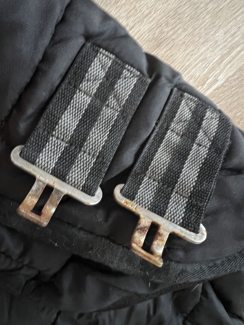Koc zimowy 155cm - Sprzedam tu używany derkę zimową w kolorze 155 czarnym z paskiem na brzuch i paskami na nogi.