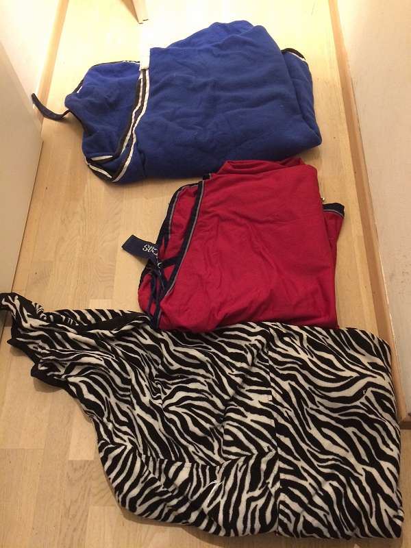 Koce dla koni - 1 jasnoniebieski polarowy dywanik 135cm €12, 1 czerwony dywanik Bucas (już naprawiony) 145cm €18, polarowy dywanik zebra z kawałkiem szyi 145cm €35