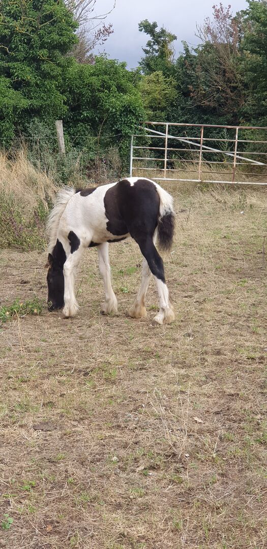 Born april 2023 Sire: 12.3hh black and white gypsy cob. Dam: 13.2 black gypsy cob x. Lilly is a very clever girl who is not only pretty but has the moves to. She will make a brilliant child's pony. She is only 4 months but already she is good to catch put head collar on, leads ties up to be groomed, picks all 4 feet up. She is up to date with the farrier and worming. Will leave with her passport and be micro chipped. Will be weaned around October time.