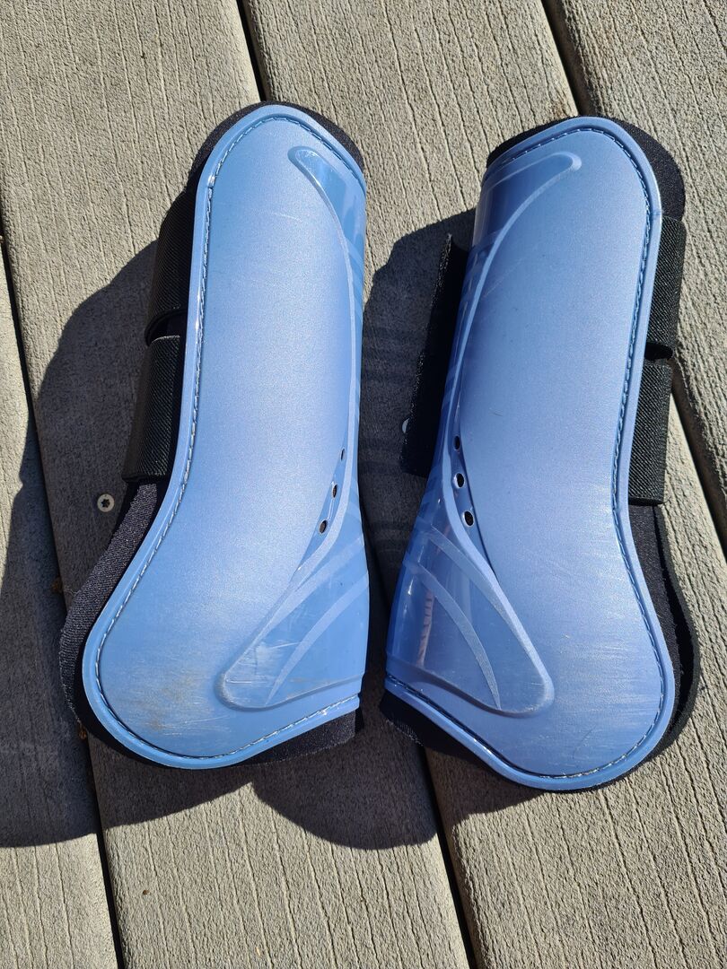 Komplet getrów jasnoniebieskich warmblood - Zestaw w bardzo dobrym stanie. Obejmuje getry i buty. Neopren i rzepy są w doskonałym stanie. Tylko buty mają kilka zadrapań widocznych na zdjęciach. Można kupić w połączeniu z pasującym ochraniaczem na siodło VS firmy HV polo. Wysyłka ubezpieczona Sprzedaż prywatna. Bez gwarancji i bez możliwości zwrotu