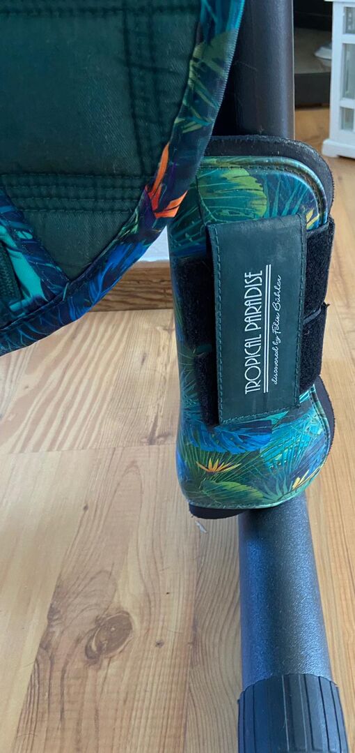 Kompletny zestaw do dżungli - Naprawdę przyciąga wzrok. Koń i jeździec są w tym samym spojrzeniu. Na wszystkich elementach nadruk z motywem dżungli. Mało używany (patrz zdjęcia). Bryczesy mają rozmiar 34.