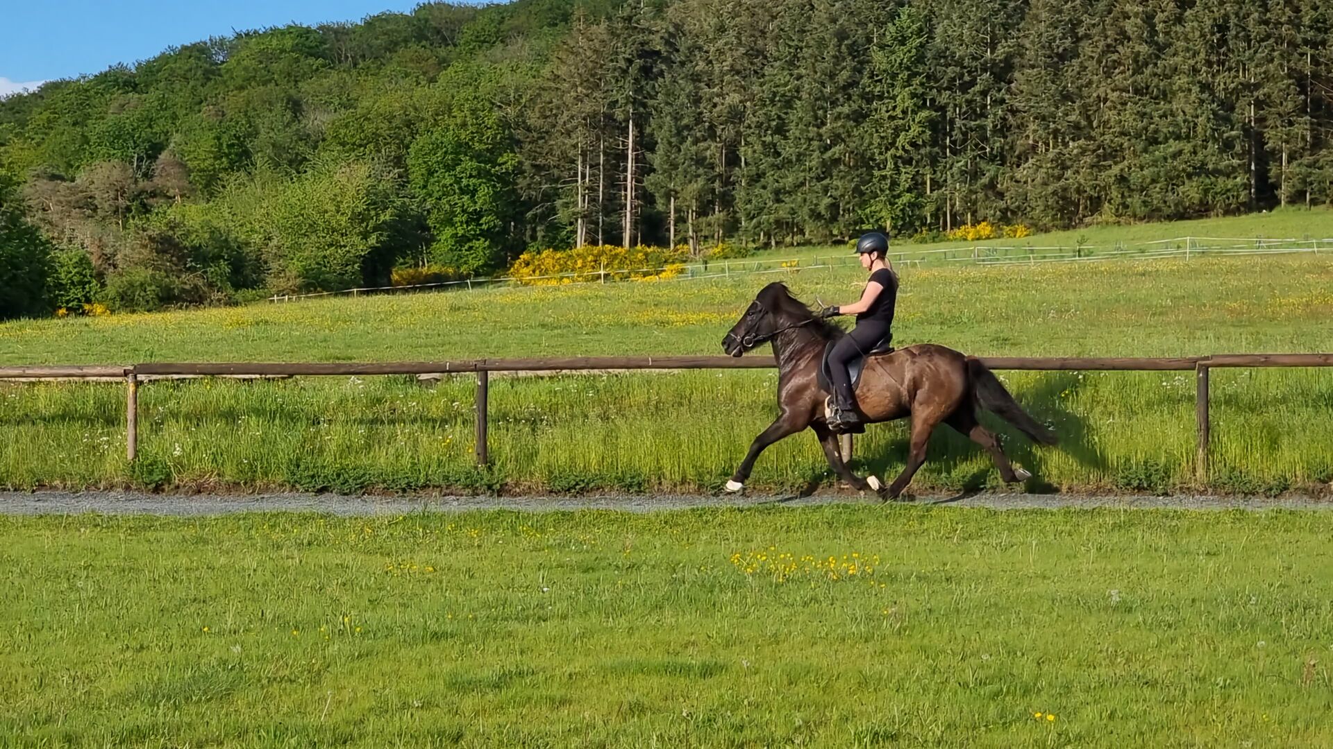 Baron ma 14 lat i jest w pełni wyszkolony. Jednak w ciągu ostatnich 3 lat był jeżdżony sporadycznie z powodu braku czasu. Obecnie jest jeżdżony od 3 miesięcy i zawsze jest przyjaznym i zabawnym koniem. Baron ma 5 chodów, wszystkie 5 chodów można wywołać w dowolnym momencie. Tölt jest łatwy do jazdy, nawet dla jeźdźców bez doświadczenia w chodach, i można z nim töltować z lub bez lejców na krańce ziemi. Jest łatwy w prowadzeniu, ale wymaga ręki prowadzącej i jeźdźca, który opanował podstawy. Dlatego też nie oceniamy go jako konia dla początkujących. Baron to skarb w obsłudze. Uwielbia być przytulany i pielęgnowany, zawsze może być obsługiwany przez każdego, a nawet może być prowadzony z jednego padoku na drugi przez moją 3-letnią córkę. Baron zna pracę naziemną, podwójne lonżowanie i pracę na długiej wodzy i zawsze jest chętny i chętny do wykonywania tych czynności. Praca z kowalem i jazda z przyczepą nie stanowią dla niego problemu. Niestety Baron nabawił się słodkiego świądu, dlatego wymaga nieco więcej opieki niż inne konie. Egzema jest czasami gorsza, czasami lepsza, w zależności od miejsca. Przy regularnej pielęgnacji stoi cały rok bez derki na skraju lasu. Jeśli jest trzymany w pobliżu wody, prawdopodobnie potrzebuje derki.