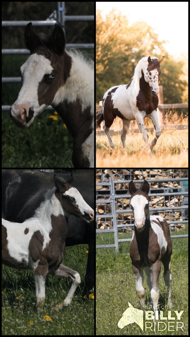 Paint Horse Stallion GM Freckles Smart Bar (nazwa w toku) Czarny Tovero z 2 niebieskimi oczami *24.03.2023 Jego wzrost szacuje się na ok. 150-153 cm. Ojciec: Freckles Big Heart (zatwierdzony przez PHCG - Bay Tovero) Matka: AHF Peponita Joe (AQHA - czarna ćwiartka) Ma 6 paneli N/N (w tym MYHM) Z papierem APHA i paszportem elektronicznym (PHCG)